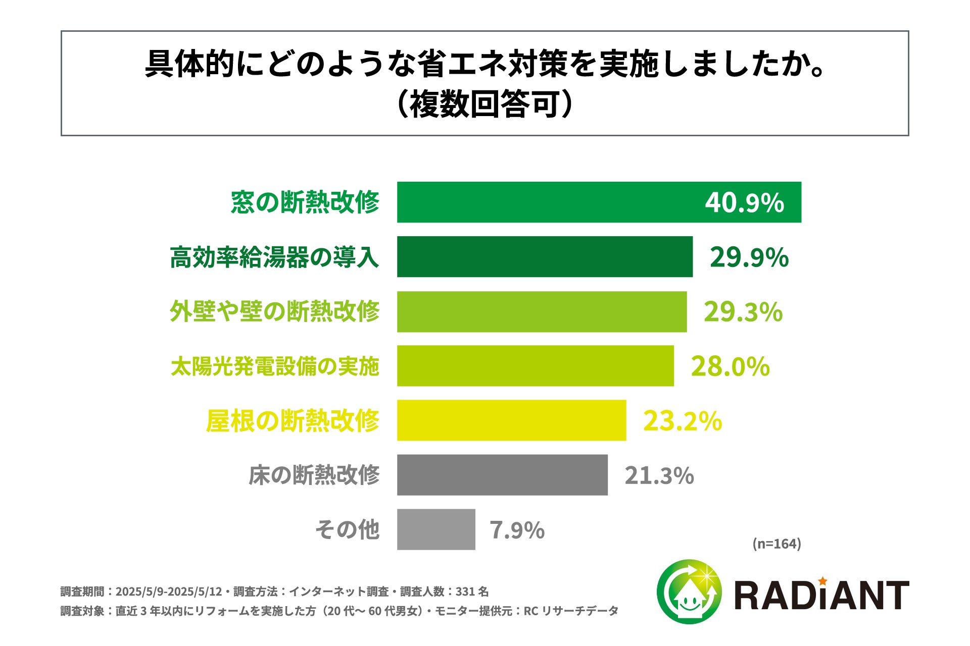 株式会社ラディエント(本社:大阪府大阪市、代表者:林 照剛)は、直近3年以内に住宅のリフォームを実施した方を対象に、住宅リフォームに伴う省エネ対策に関する実態調査を実施しました。この調査結果から、近年住宅リフォームを実施した方の住宅への省エネ対策の実施実態等が明らかになりました。