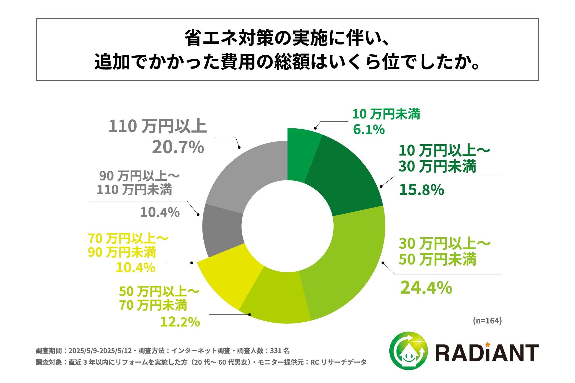 ・省エネ対策の実施に伴い、追加でかかった費用の総額は「50万円未満」の人が約4割いる一方、「110万円以上」の人も約2割おり、人により様々