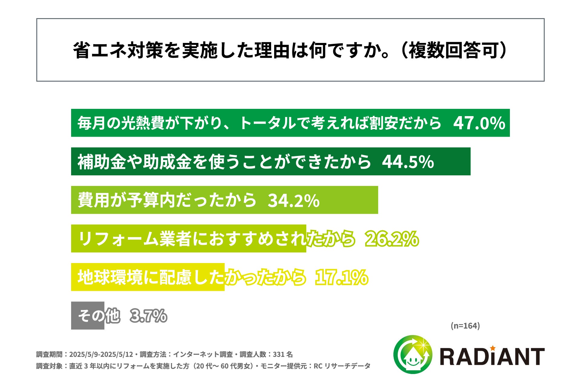 近年、燃料費や電気代・ガス代の高騰や、脱炭素社会への意識向上を背景に、住宅リフォーム市場においても省エネ・断熱性能向上へのニーズが高まっています。一方で、実際の導入に際しては「費用感」や「効果実感」への不安から踏み切れていない人もいるのでないでしょうか。そこで株式会社ラディエントは、直近3年以内に住宅のリフォームを実施した方を対象に、住宅リフォームに伴う省エネ対策に関する実態調査を実施しました。