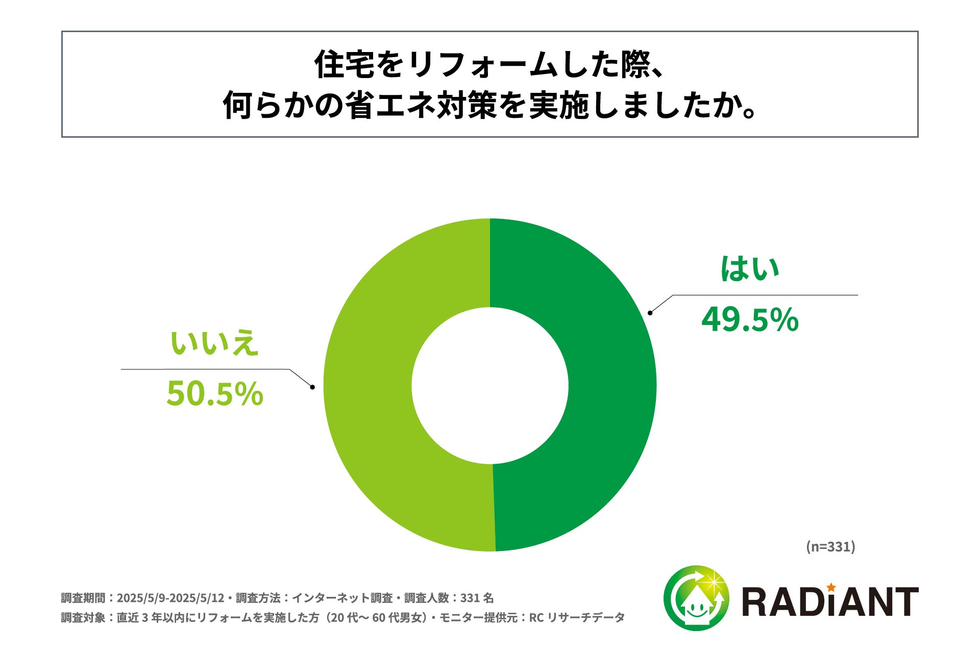 直近3年以内に住宅をリフォームした人の約半数が、省エネ対策を実施している!株式会社ラディエントが「住宅リフォームに伴う省エネ対策に関する実態調査」を実施!