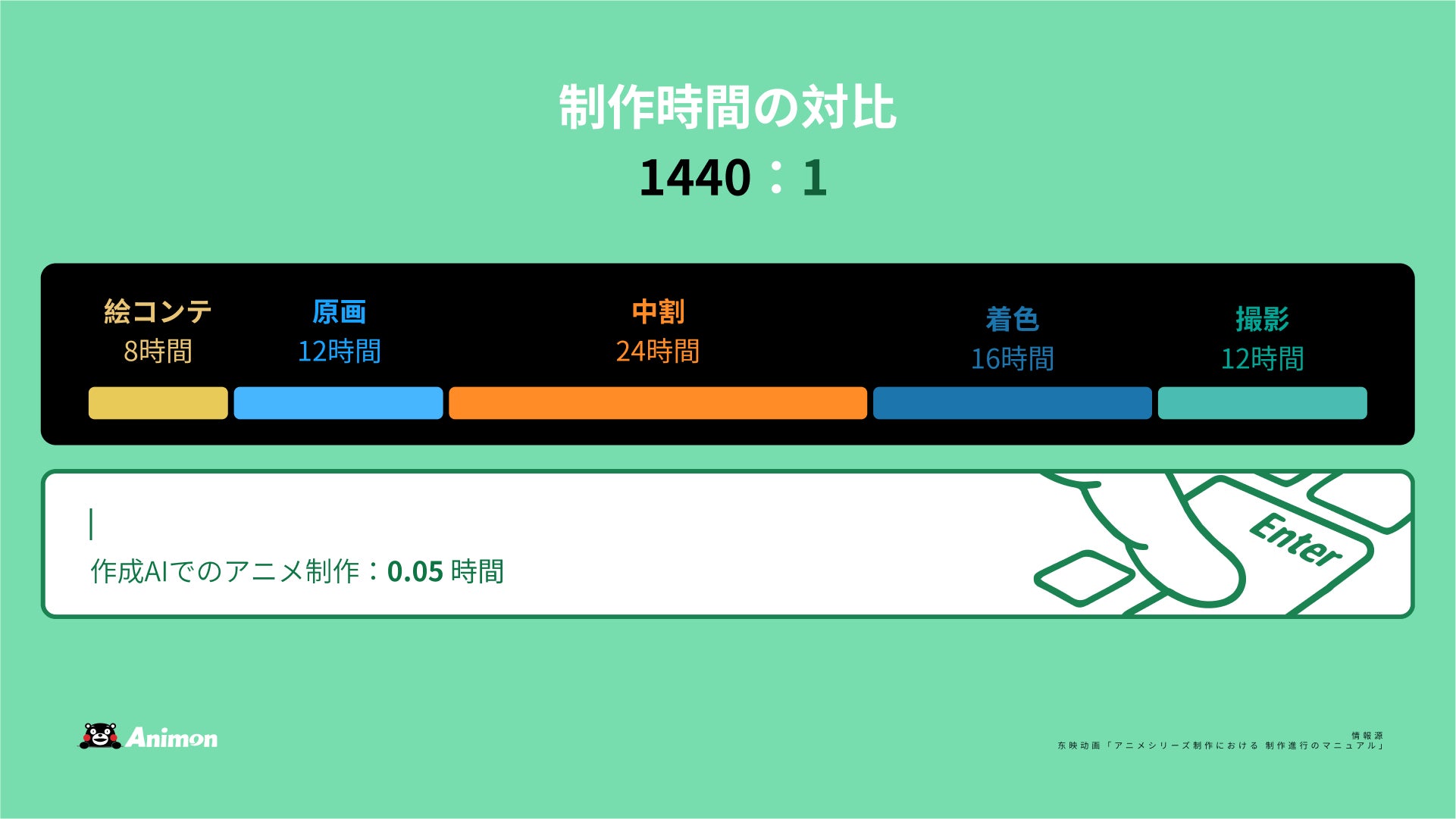 従来、絵コンテ・原画・中割・着色・撮影など複数の工程に72時間以上を要していたアニメ制作を、わずか「3分」で自動生成できます。