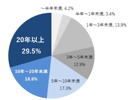 投資経験者のうち、29.5%が投資歴「20年以上」、18.8%が投資歴「10年~20年未満」で、約半数(48.3%)が投資歴10年以上であった。