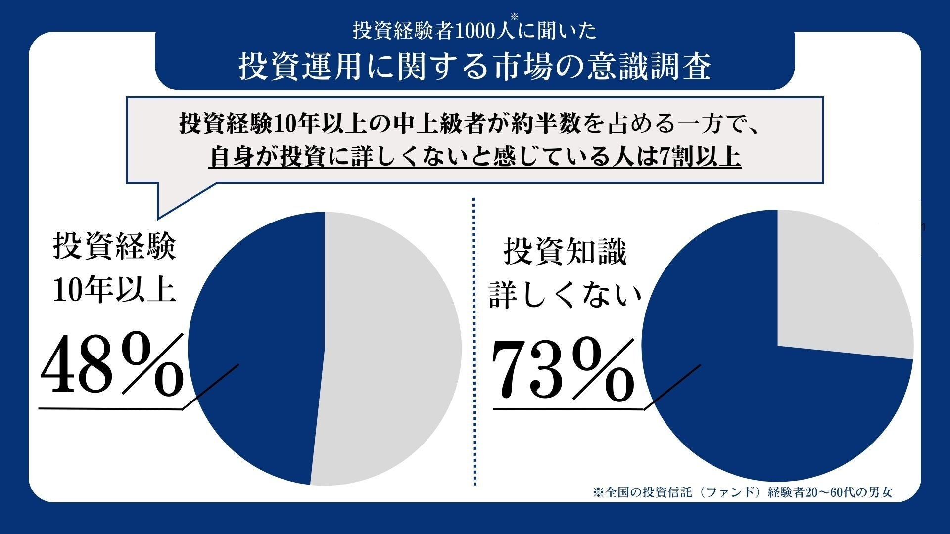 今回の「投資運用に関する市場の意識調査」では、回答者の約半数が投資歴10年以上である一方で自身の投資に関する知識に自信がない人が多数を占めていることや、投資信託を選ぶ際には過去のリターンやリスクが特に重視されていることなど、日本の個人投資家の実態が明らかになりました。