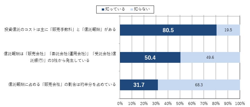 投資信託のコスト構造について「販売手数料」と「信託報酬」があることを理解している人は8割以上(80.5%)いる一方で、信託報酬のコスト構造を完全に理解している人は約3割(31.7%)であった。