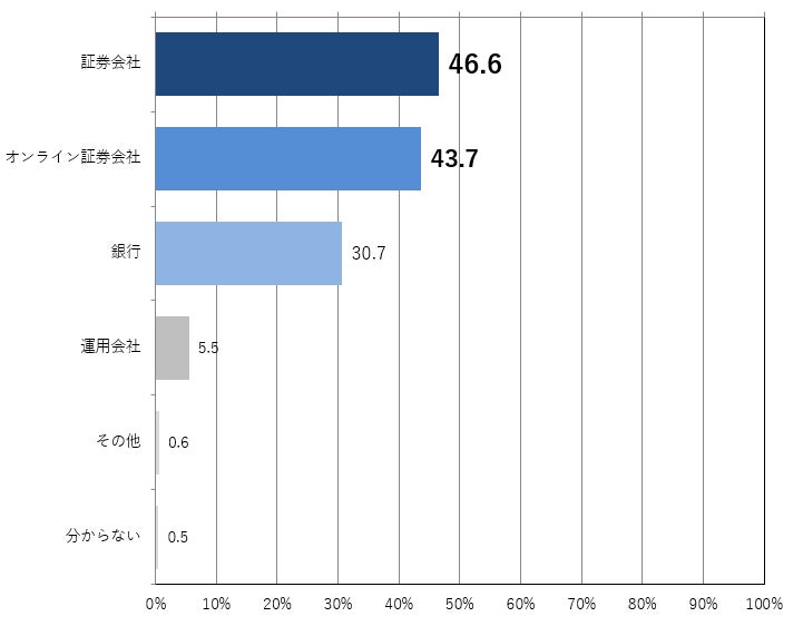 投資信託を購入した場所は「証券会社(46.6%)」に次いで「オンライン証券会社(43.7%)」が多い一方で、運用会社での利用率は5.5%にとどまっており、大多数の投資経験者が証券会社または銀行で投資信託を購入していることが明らかになりました。