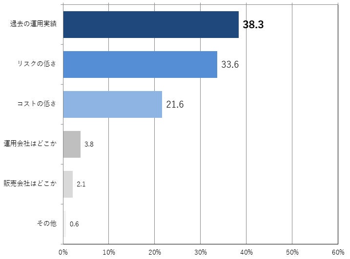 投資信託を選ぶ際に最も求めるポイントについては「過去の運用実績」が38.3%で最も多く、購入後に運用実績を把握している人は6割以上(62.7%)であった。
