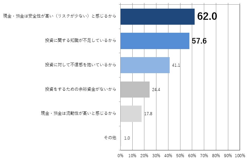 また、日本人が投資を控え現金・預金に多くの資産を当てる理由としては、「現金・預金は安全性が高い(リスクが少ない)と感じるから(62.0%)」「投資に関する知識が少ないから(57.6%)」が多く、預金への信頼度が高く、投資にハードルを感じる傾向にあることが読み取れます。