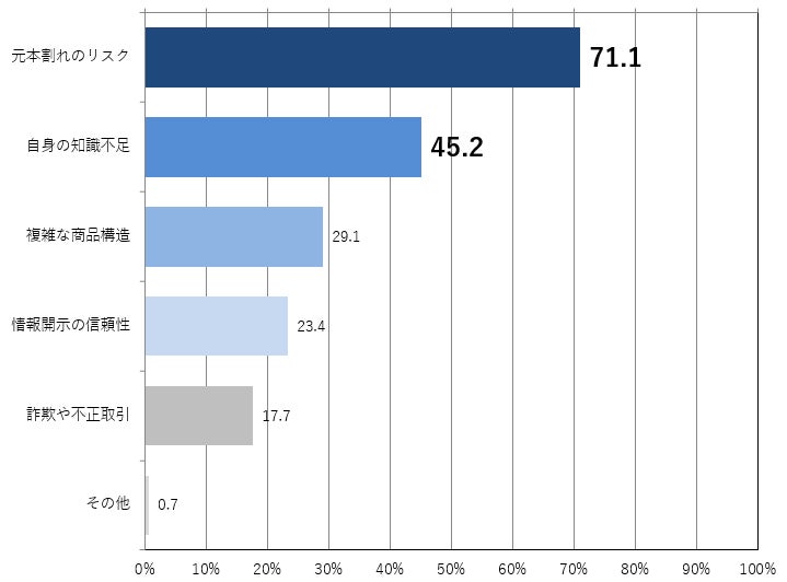 また、投資に関する不安や懸念については、「元本割れのリスク(71.1%)」が最も多く、次いで「自身の知識不足(45.2%)」と、ここでも日本の投資家の預金への信頼度の高さや投資知識への自信の低さがうかがえる結果が明らかになりました。