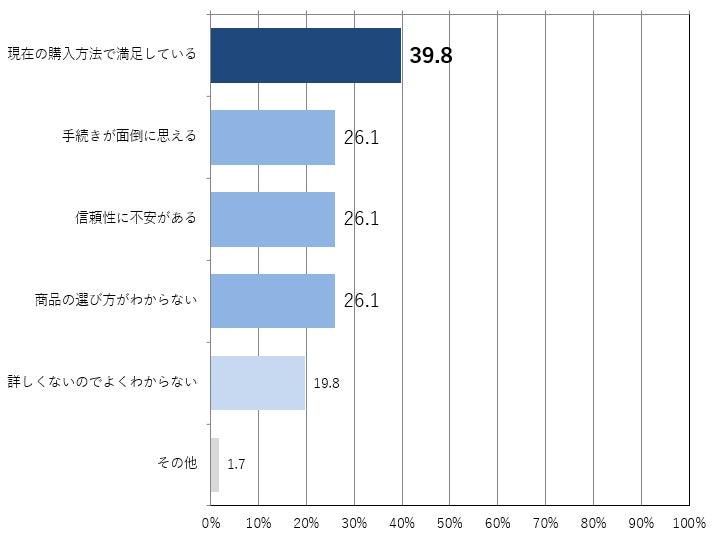 「運用会社」から投資信託を直接購入することを知っていても利用したことがない理由としては、「現在の購入方法で満足している(39.8%)」が最も多く、「信頼性に不安がある(26.1%)」や「手続きが面倒に思える(26.1%)」といった回答もあり、証券会社のサービスに満足する声や、運用会社に対して漠然とした懸念を感じる投資家がいることが読み取れます。