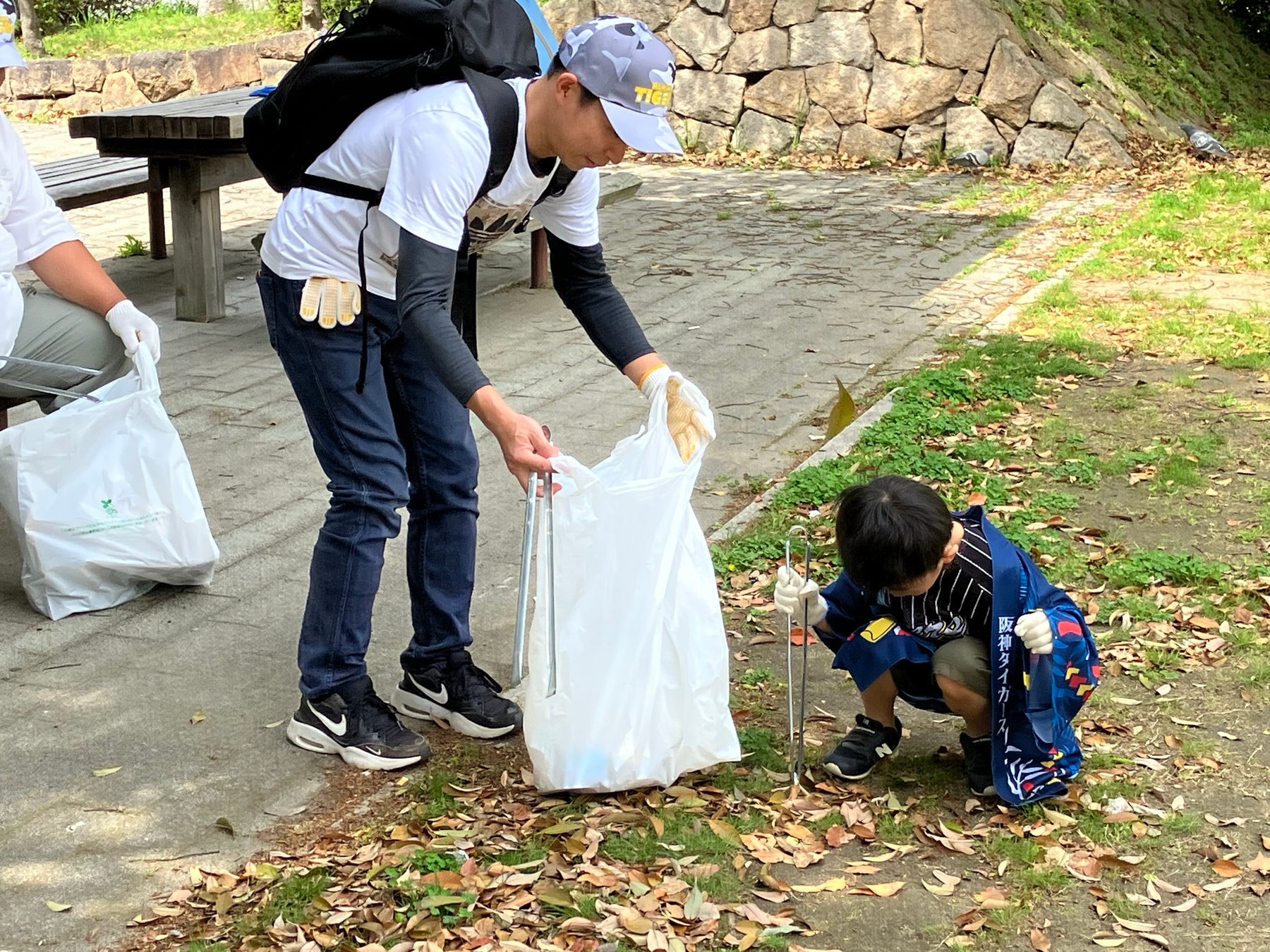 糸井さんや岩田さんも、参加者と一緒にゴミ拾いを行いながら、積極的に子どもたちと交流。糸井さんはペットボトルを見つけると「ここから取れるよ!いけいけ!」とゴミの取り方を子どもたちにアドバイス。子どもたちは「見てみて!取れたよ!」と元気よく返事をしながら楽しそうに清掃を続けました。1人の子どもが靴下を発見した場面では、糸井さんは「これ絶対阪神の選手のや!ここで着替えたんや!」とボケを交えて返答していました。岩田さんは、「あっちにもたくさんゴミがあるで!回収回収!」と声をかけ、子どもたちと一緒に細かいゴミまで丁寧に拾いました。1人の男の子が、見つけにくい場所にあったゴミを発見した際には、岩田さんは「よく見つけた!ファインプレーや!」と喜ぶ表情を見せ、子どもたちを励ましていました。