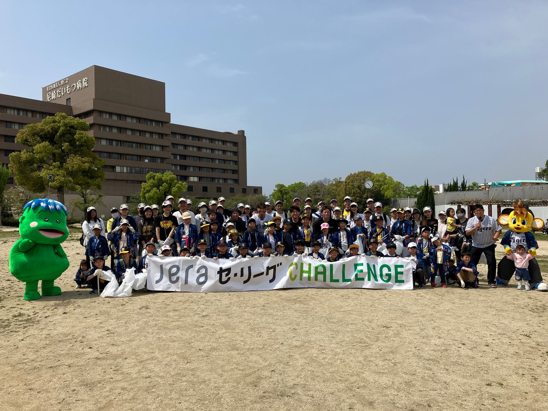 株式会社JERA(本社:東京都中央区、代表取締役会長 Global CEO:可児 行夫および代表取締役社長CEO兼COO:奥田久栄)は、プロ野球を通じた社会貢献活動の一環として、阪神タイガースと協力し、スタジアム周辺の清掃活動を行うことを目的に、兵庫県尼崎市の大物公園・稲川公園にて「JERA セ・リーグ CHALLENGE シティクリーン プロジェクト」を2025年4月19日(土)に開催しました。本イベントには、阪神タイガース公式ファンクラブKIDS会員の小学生・保護者29組60名と尼崎市民9組22名の計38組82名が参加し、阪神タイガースOBの糸井嘉男さん、岩田稔さん、陽川尚将さん、江越大賀さん、そして球団創設90周年の節目の年に入団したトラッキーの弟コラッキーとともに、公園内の清掃活動を実施しました。