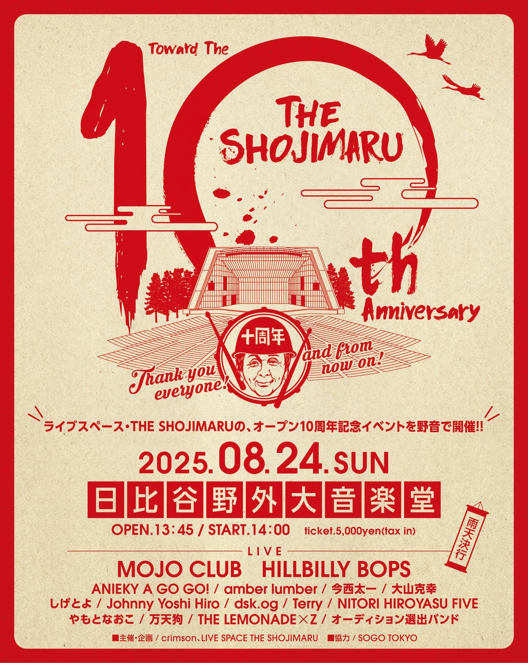来年10周年を迎えるTHE SHOJIMARUが「プロ、アマチュアを交えたTHE SHOJIMARUゆかりのアーティスト達、お客様とで『あの景色を一緒にみたい!』」との想いを込め、日比谷野外音楽堂最後の夏にイベントを行います!メインアクトはヒルビリーバップスとMOJO CLUB 。そして、THE SHOJIMARUでライブを続けてきたアーティスト達。さらにオーディションで勝ち上がったアーティストを加えて盛り上がります!!