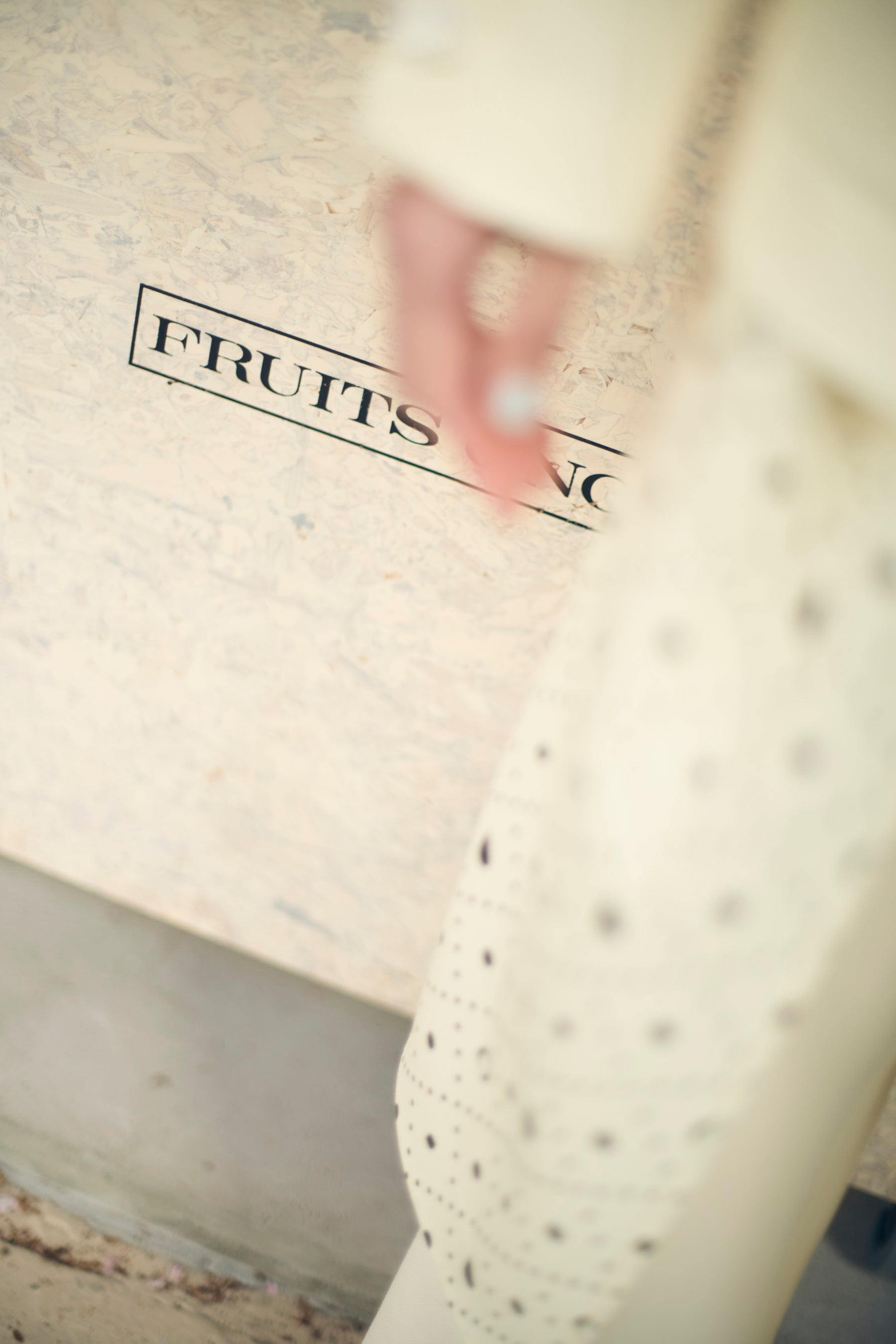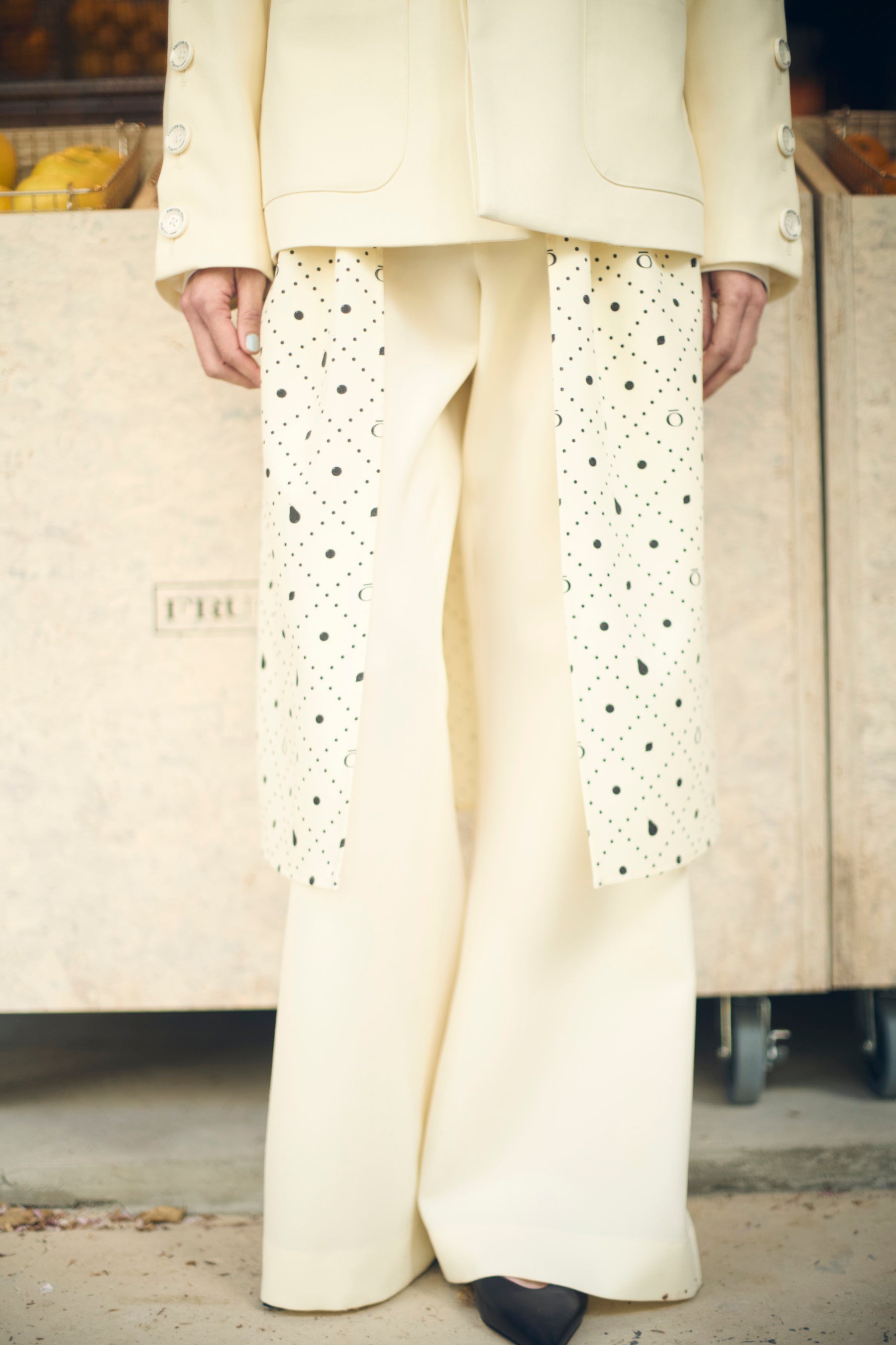 ベルボトム型のクラシックなシルエットをベースにしたスラックスは、身体の動きに沿って滑らかにカーブ。上に重ねるバムフラップは、八百屋で使われてきた前掛けをルーツに、現代的にアレンジ。「FRUITS ŌNO」のロゴを分解してドット状に再構築したグラフィックが散りばめられ、遠目には模様のように、近づくと文字や果物が浮かび上がる視覚的な仕掛けを施しています。