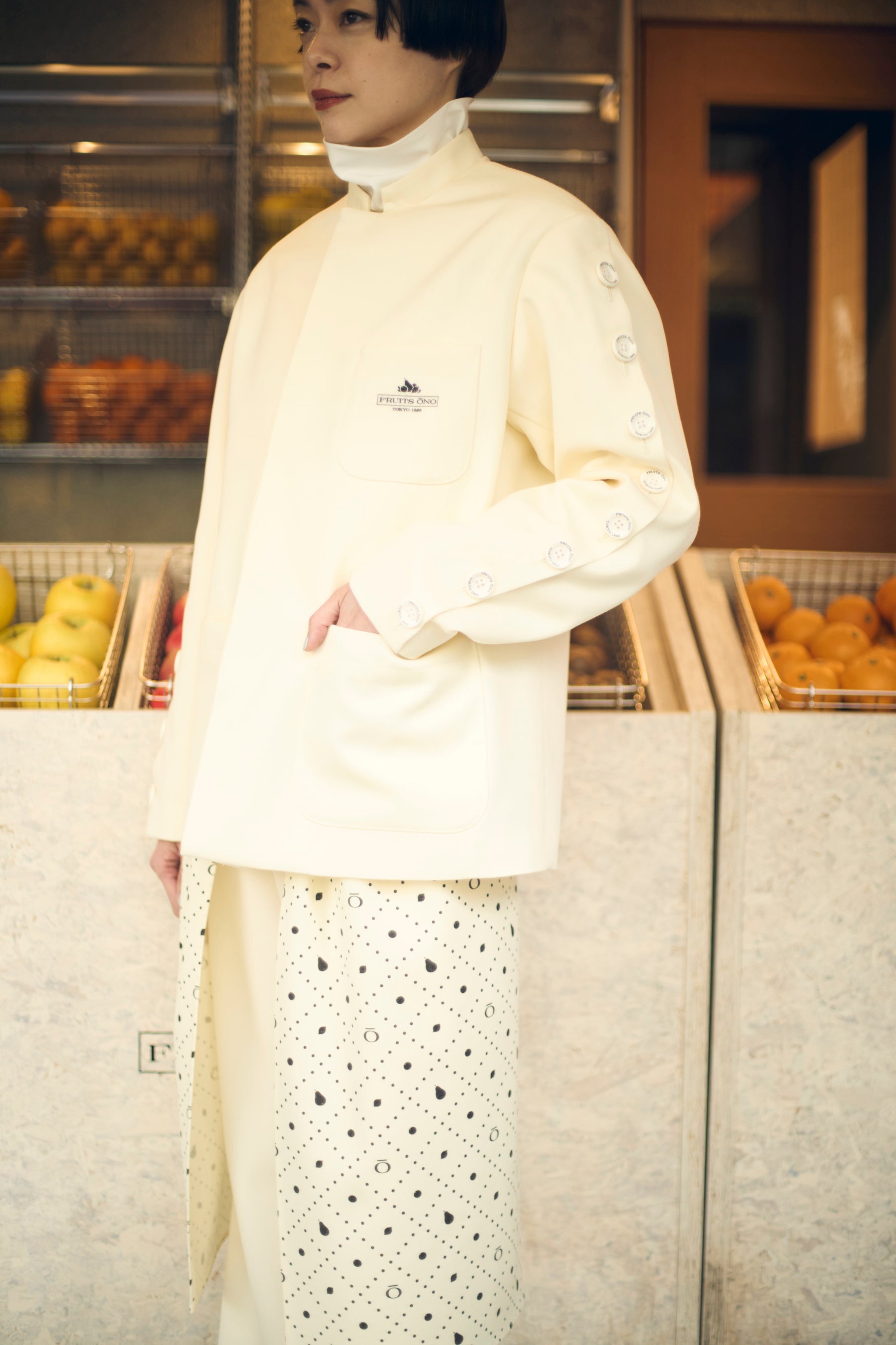 ジャケットは、1980年代のバージャケットの要素を取り入れながら、袖口と胸ポケットに「FRUITS ŌNO」のロゴを配置。連続した袖ボタンは外して開くこともでき、機能美も備えています。