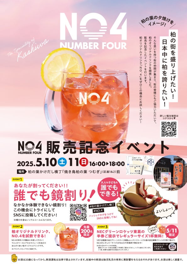 また、販売開始を記念し、5月10日(土)・11日(日)は柏の葉かけだし横丁にて「No.4」の試飲と誰でも鏡開きが体験できるイベントを開催いたします。