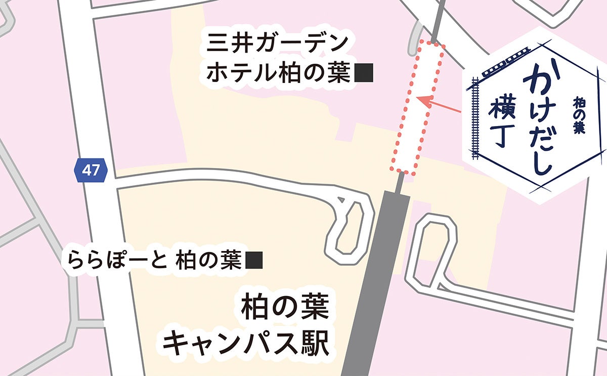 「柏の葉かけだし横丁」は柏の葉スマートシティに集う人々の新たなコミュニケーションスペースとして2018年に誕生しました。柏の葉かけだし横丁は、柏の葉スマートシティの玄関口として、人と街の“はじめの一歩(=かけだし)”を応援し、地域の新しいコミュニティや賑わいを生み出すことを目指しています。