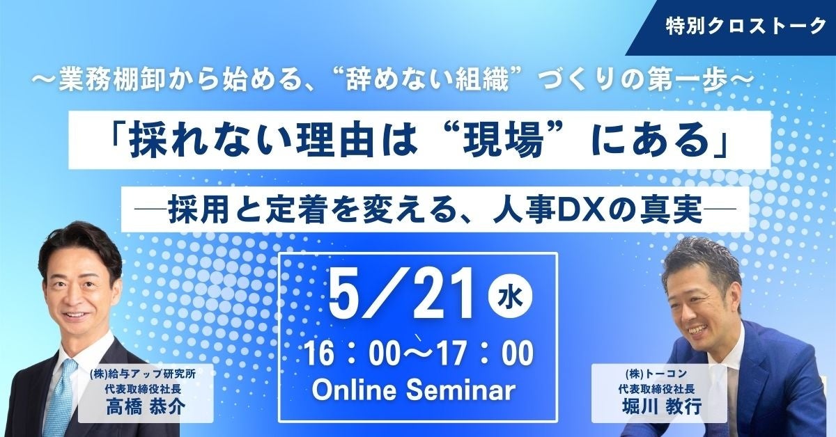 “辞めない組織”のつくり方〜業務棚卸×採用DX×評価制度設計による戦略的人材マネジメント~と題した無料オンラインセミナーを2025年5月21日(水)16:00より開催いたします。