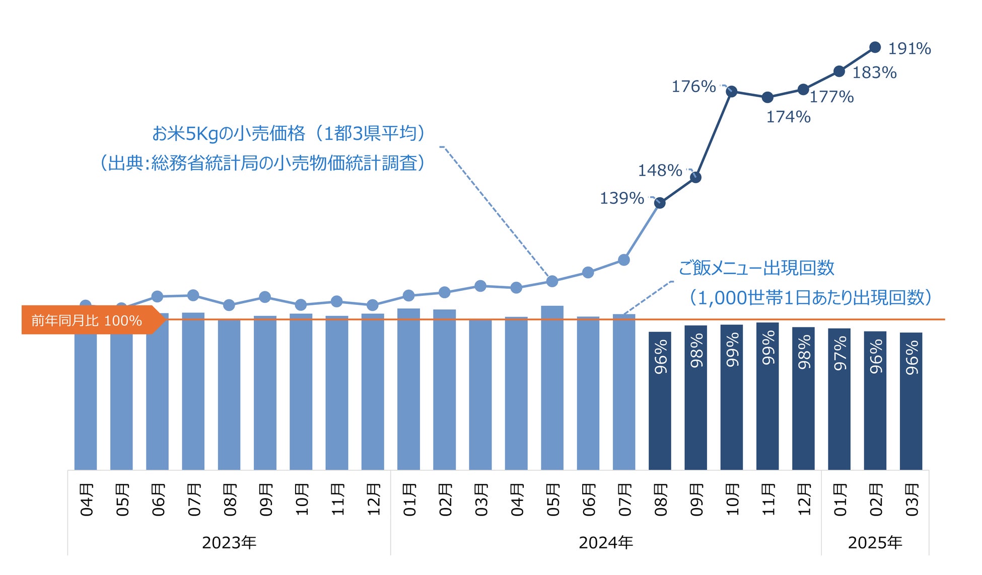 2024 年8 月 総務省小売物価統計調査によると米5Kg の小売価格は前年1.3 倍を超え上昇。同じ頃、食卓では お米メニュー(ご飯食)の出現頻度が前年割れとなりました。さらに2025 年3 月には、お米メニューは前比95.8%とさらに低下。お米離れが進む中、食卓ではどのような変化が起きているのでしょうか。