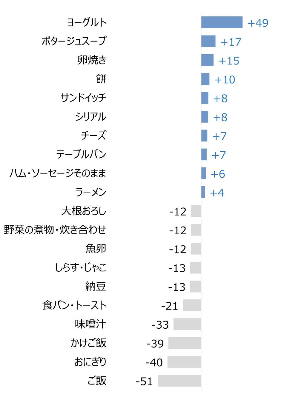 お米メニューは朝食や昼食では何かに置き換えても、やはり”夕食ではお米を食べたい”という生活者の気持ちが表れているようにも感じます。この朝食を詳しくみると【図6.】ご飯やおにぎりの他、味噌汁や納豆、煮物が減少し、サンドイッチやシリアル、スープへと置き換わっています。