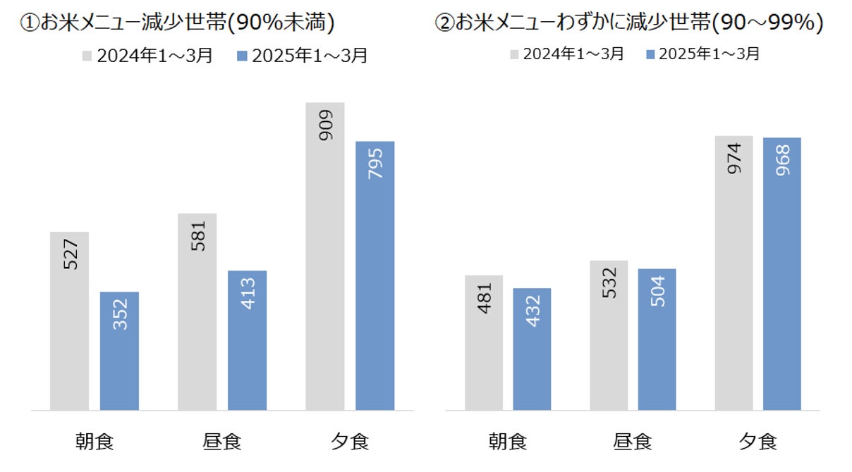 2024 年1月~2025 年3 月(15 か月間)の通期在籍モニターを対象に、1~3 月のお米メニューの出現頻度を算出。モニター毎の前年増減状況でセグメントしたところ、59%の世帯でお米メニューは前年割れ。なかでも30%の世帯は1 割以上も減少しておりました。お米高騰は生活者に広く影響を与えていることが分かります。