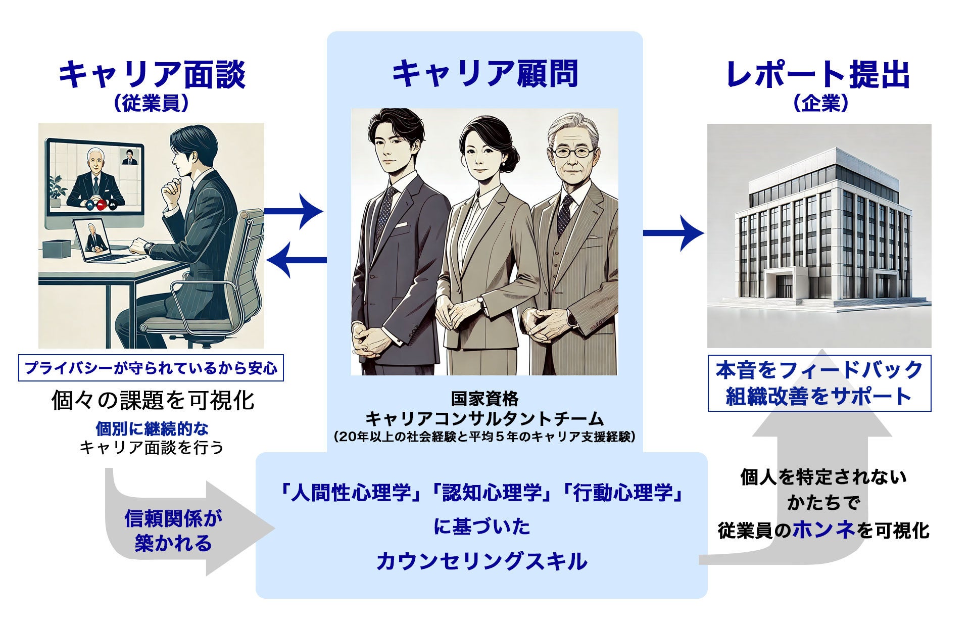 従業員とのキャリア面談を継続的に行う事で、洞察力を持って従業員の真意を聴き取り、カウンセリングを行いながら、課題を可視化して企業に繋げていきます。