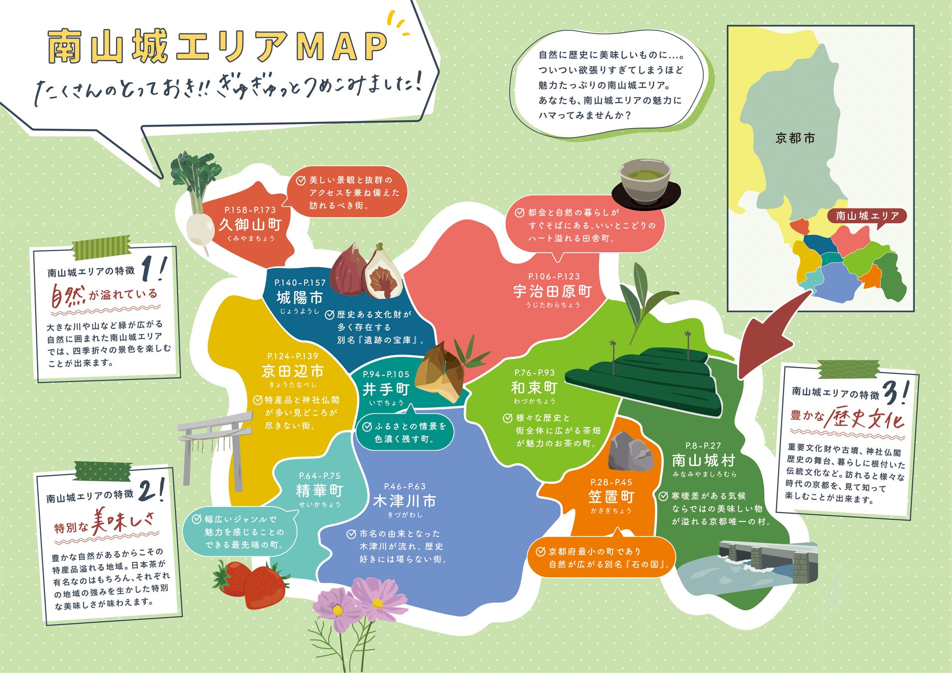 京都府の南部に位置し、豊かな自然や歴史を感じる町並み、土地の特徴を活かした特産品が溢れる南山城エリア。飲食店をはじめ、お買い物・体験ができる場所など、この地で愛されているスポットを幅広いジャンルで紹介しています。おすすめの商品や店内の雰囲気だけでなく、お店を始めたきっかけや今後の展望など、店主の方々の人柄や想いを中心に、「気持ち」の部分に目を向けた内容となっております。