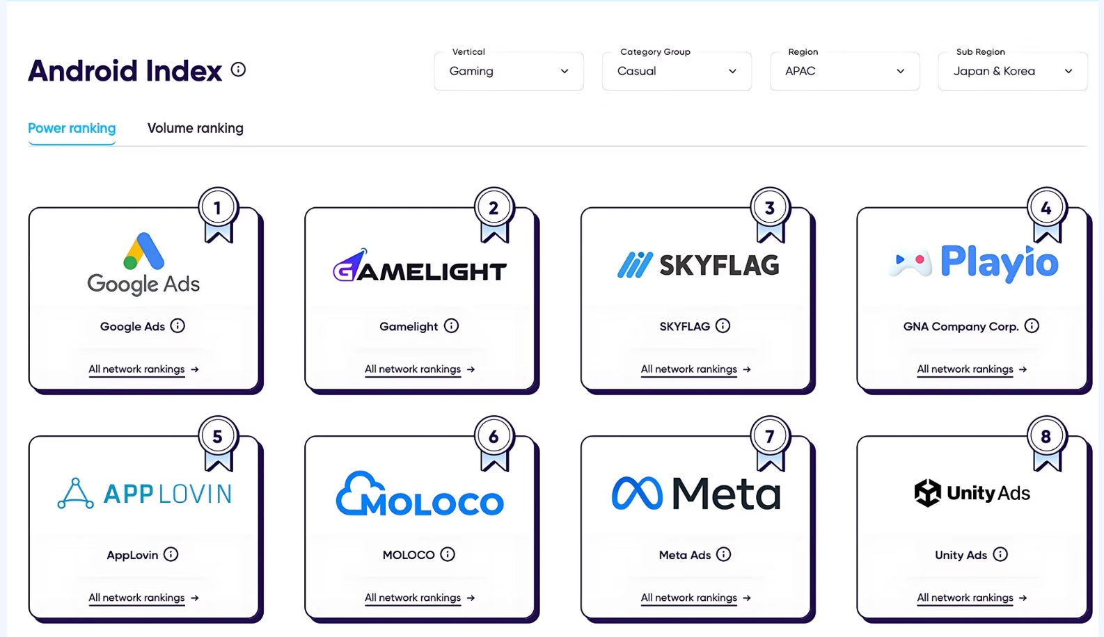 Gamelightの継続的な成功は、AppsFlyerパフォーマンスインデックスにおける評価にも明確に