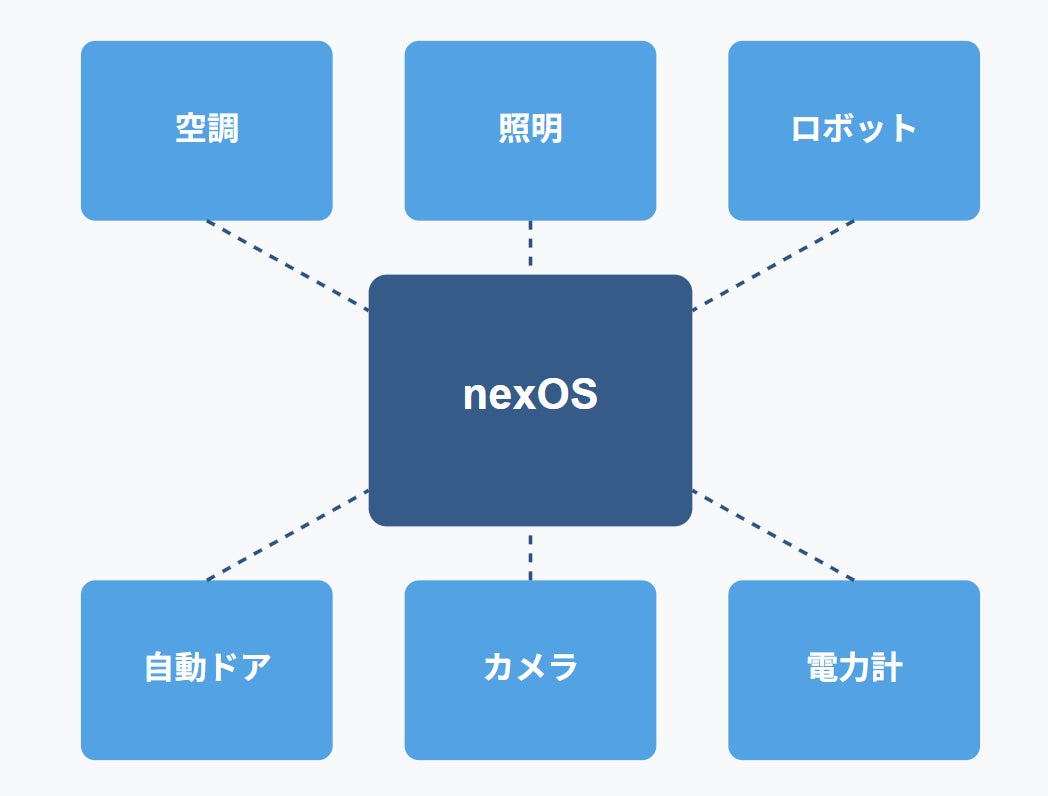 空調・照明・自動ドア・電力計・監視カメラ・自律移動ロボットなど多様な設備を標準的なインターフェースで接続可能です。これらの設備の状態確認や制御をnexOSを通じて行うことで、照明や空調のオンオフ操作、温度・風量調整、自動ドアの開閉や施錠、電力消費のリアルタイムモニタリング、カメラ映像の管理、さらにはロボットの運行管理までを統合的かつ容易に実施できる環境を提供します。