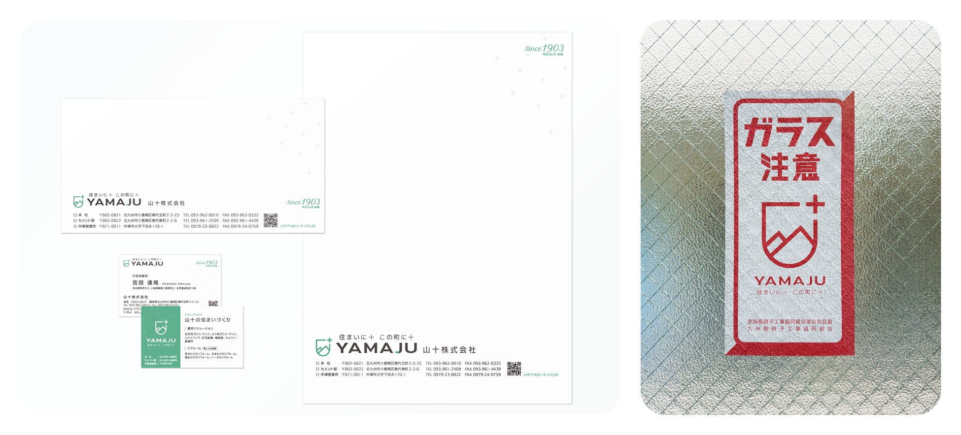 また名刺や封筒だけでなく、建築現場での活動も多い山十だからこそ、納品・施工時にガラスに張る事故防止の張り紙などもこだわりを持って作りました。