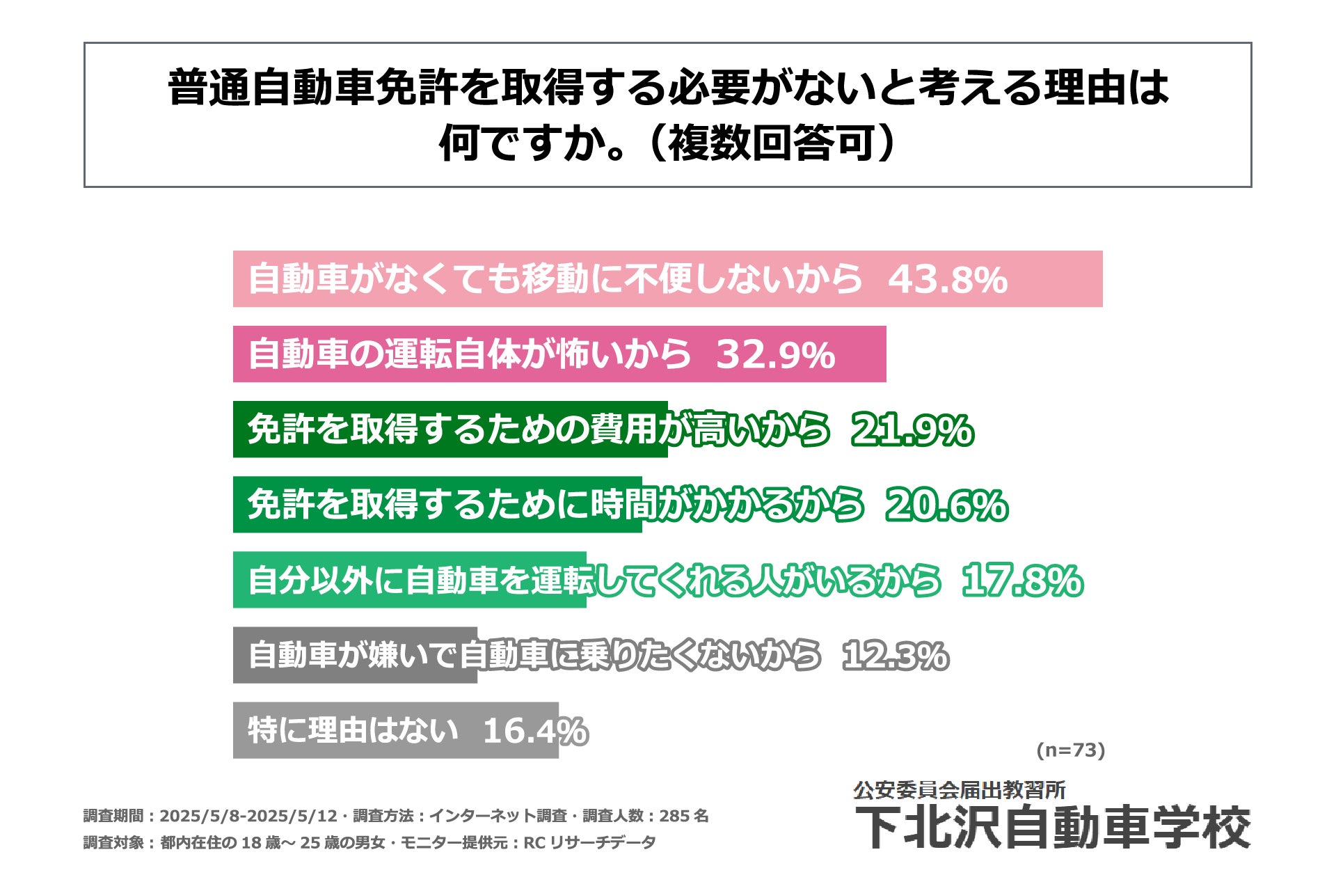 調査の最後、普通自動車免許を持っておらず、今後取得する予定もないと回答された方に「普通自動車免許を取得する必要がないと考える理由」を尋ねる設問の回答で多かったのは、1位が「自動車がなくても移動に不便しないから」で43.8%、2位が「自動車の運転自体が怖いから」で32.9%、3位が「免許を取得するための費用が高いから」で21.9%という結果になりました。この結果から「自動車がなくても移動に不便しないこと」が普通自動車免許を取得しない最大の理由であることが明らかになりました。