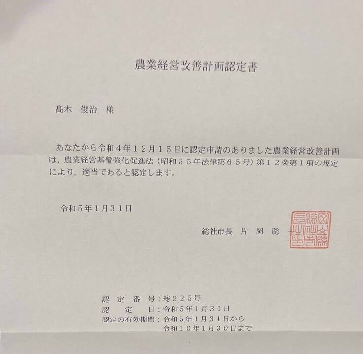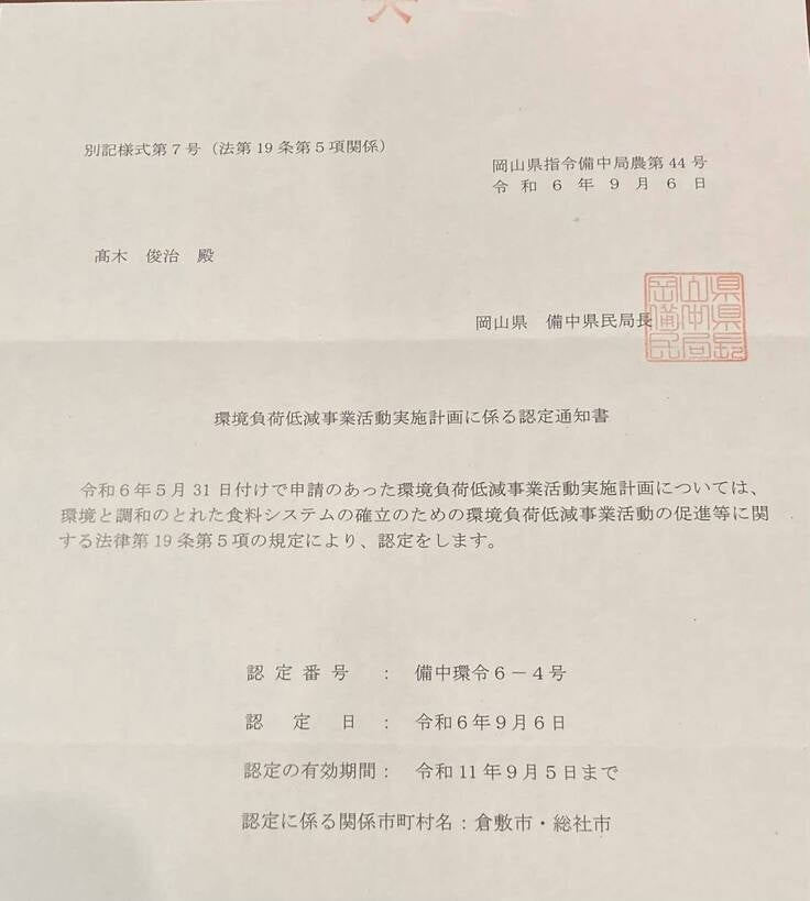 2024年には、化学肥料や化学農薬、除草剤など使用量を削減して環境に優しい農業を行っている農家として、岡山県より「みどり認定」を認定して頂きました。