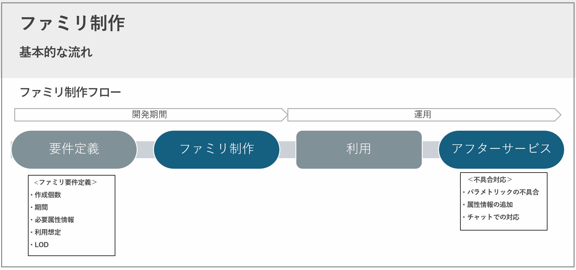 施工図などさまざまなフェーズに対応していないなど、ファミリの汎用性が無く作り直しが多い