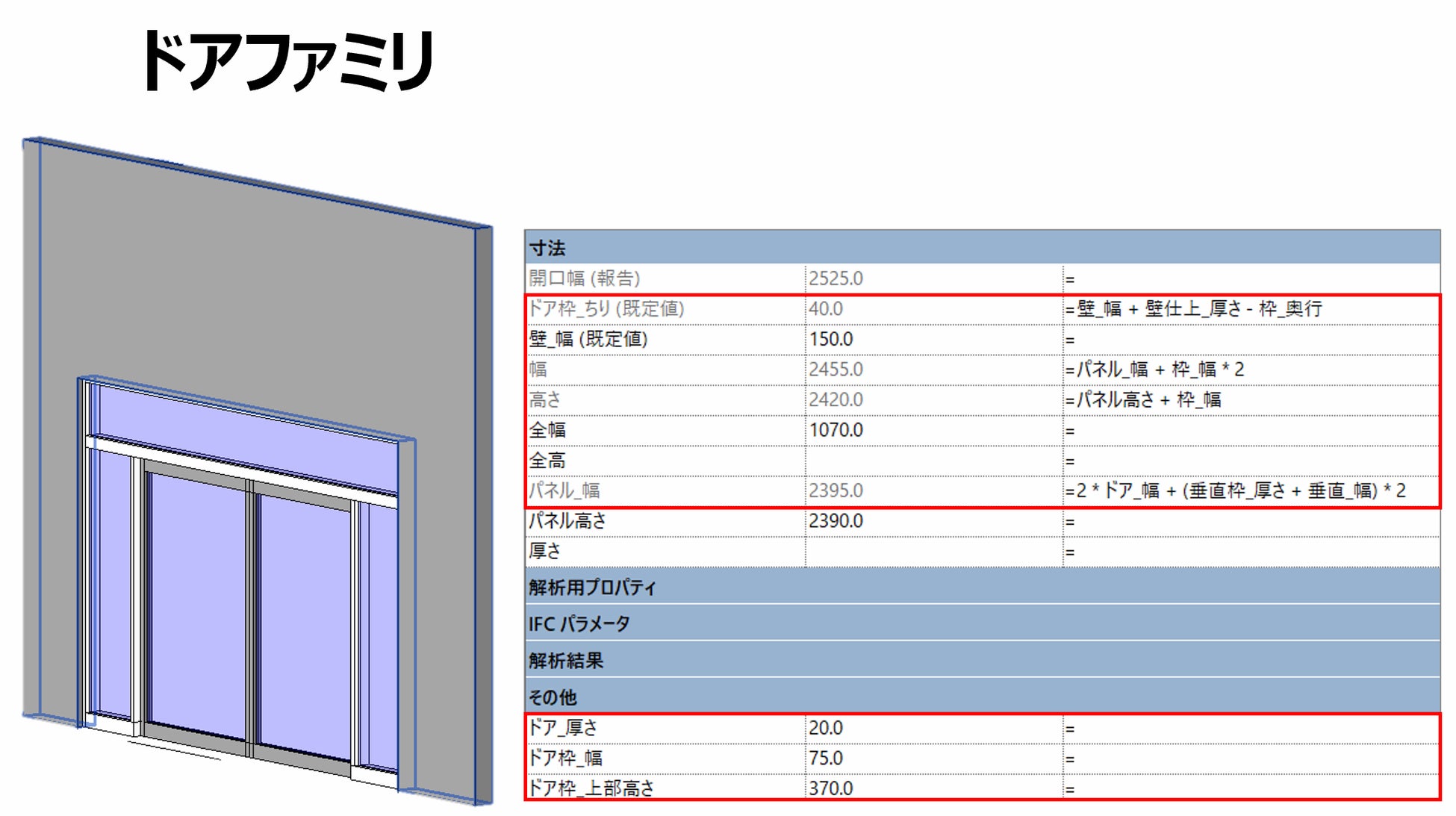 ○パネルのサイズを通じてドアの幅・高さを制御できるように、パネルの幅・高さパラメータの式で連動する式を設定する。 ※ドアのパネルの幅や高さだけ入力して、ガラスのサイズ、ドアの全体幅・高さも自動的に計算される。 |