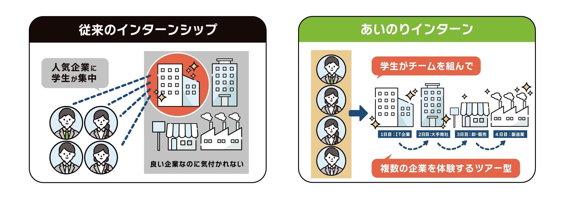 一方で「あいのりインターン」は、学生が「企業名」ではなく「期間」で参加するツアー型のインターンシッププログラムです。この仕組みにより、企業は知名度に関わらず確実に学生との接点を持つことができ、学生にとっても新たな企業や職業、働き方との出会いを提供する、まさに両者Happyの地域貢献型企画です。このように企業・学生双方にこれまでにない出会いを生み出す、画期的なインターンシップとして注目を集めています。