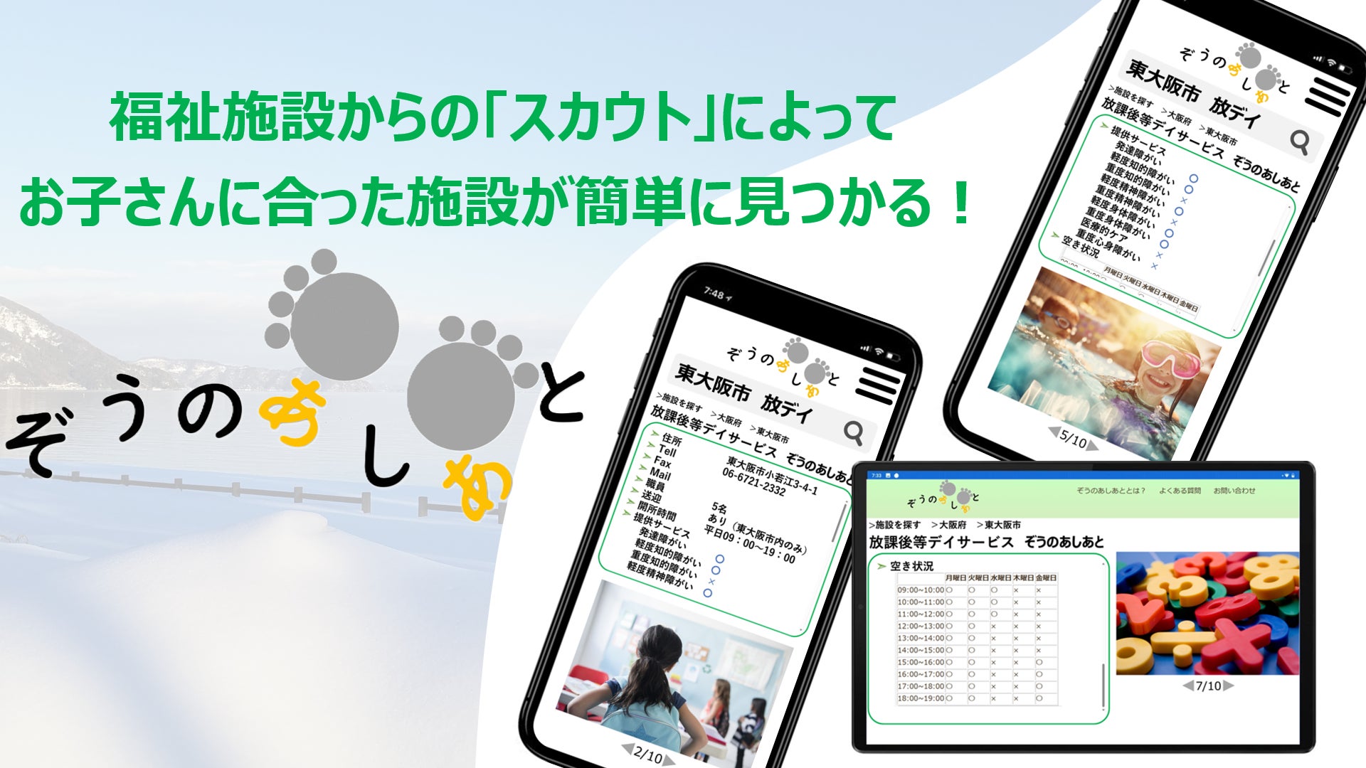福祉施設側から「スカウト」が届くというこれまでになかった新しい仕組みを構築することで、保護者と施設のすれ違いをなくし、双方にとってストレスの少ないマッチングを可能にするサービス 『ぞうのあしあと』を開発しました。