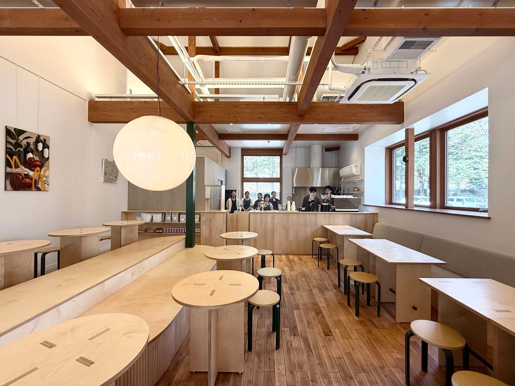 今回のお店の内装は日本ではプラダ青山店の設計などで知られるHerzog & de Meuron(ヘルツォーク&ド・ムーロン)を経て自身の事務所を設立された高濱史子さん(髙濱史子小松智彦建築設計)にお願いしており、ØC tokyoが青がキーカラーなのに対して、Hyggeのコンセプトに合わせて深緑がキーカラーの落ち着いた雰囲気になっています。テーブルやベンチはバーチ材(白樺)で製作され、北欧のテイストが感じられる居心地のいい空間で、クレープとコーヒーをぜひお愉しみください。