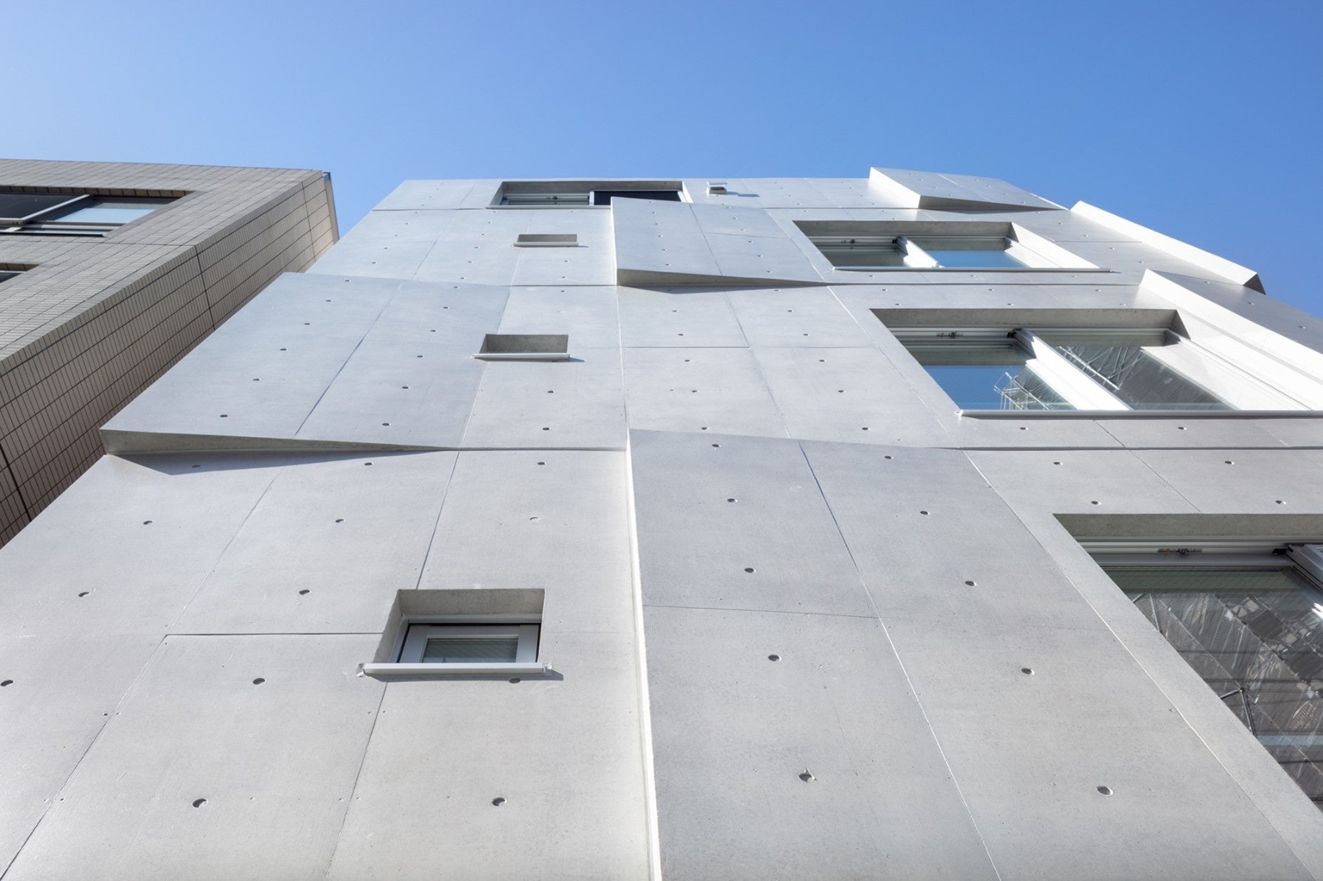 東京の中心、港区白金に位置する集合住宅・店舗・事務所の複合ビル「ESCENARIO白金」は、五の橋からの通りの四差路角地にあり、街角にあるアイコニックなデザインを意識しています。ファサードはコンクリート打放しで、渦巻状に変化したコンクリート面が特徴的です。このデザインにより、季節や時間によって多様な表情を見せることが出来ます。各住居はワンルームから1ベッドルームタイプで、正方形の開口部が空間の広がりを演出します。可動壁を用いた多様な空間構成が可能で、メインの用途である住居の居住者が自在にリビング、ダイニング、ベッドルームを変化させることができます。4階と5階はメゾネットで、ロフトスペース付きのペントハウスとして設けられています。多様な屋内外の空間を提供し、ミニマリズムを基調に、素材と大らかな空間構成により居住者が主人公となる豊かなライフスタイルを提案しています。