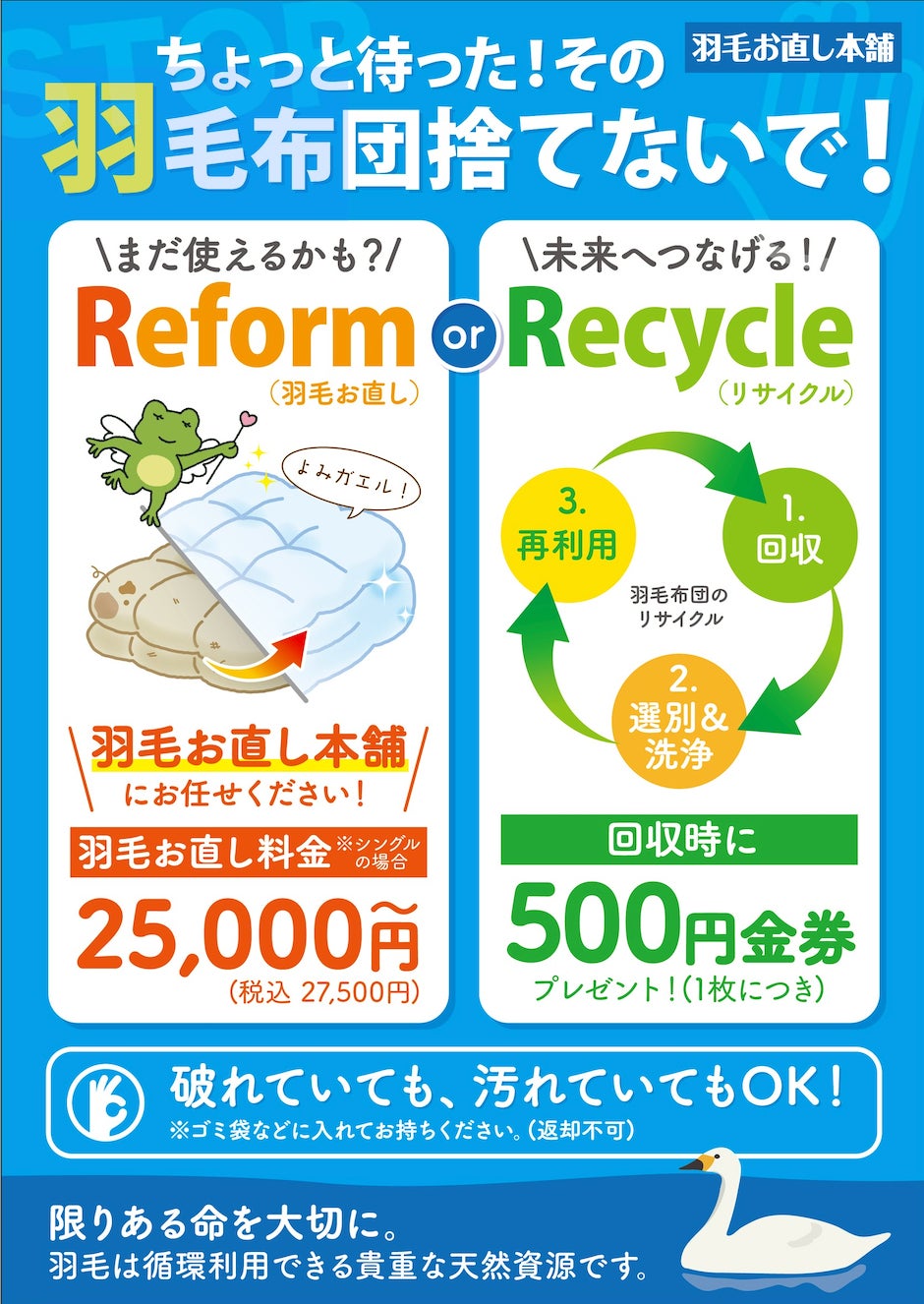 この度、羽毛布団のケアと循環型ビジネスを同時に取り組む新しい試みとして、「羽毛お直し本舗」をスタートします。ご賛同いただけるクリーニング事業者様と広く展開し、限りある天然の環境資源と向き合ってまいります。