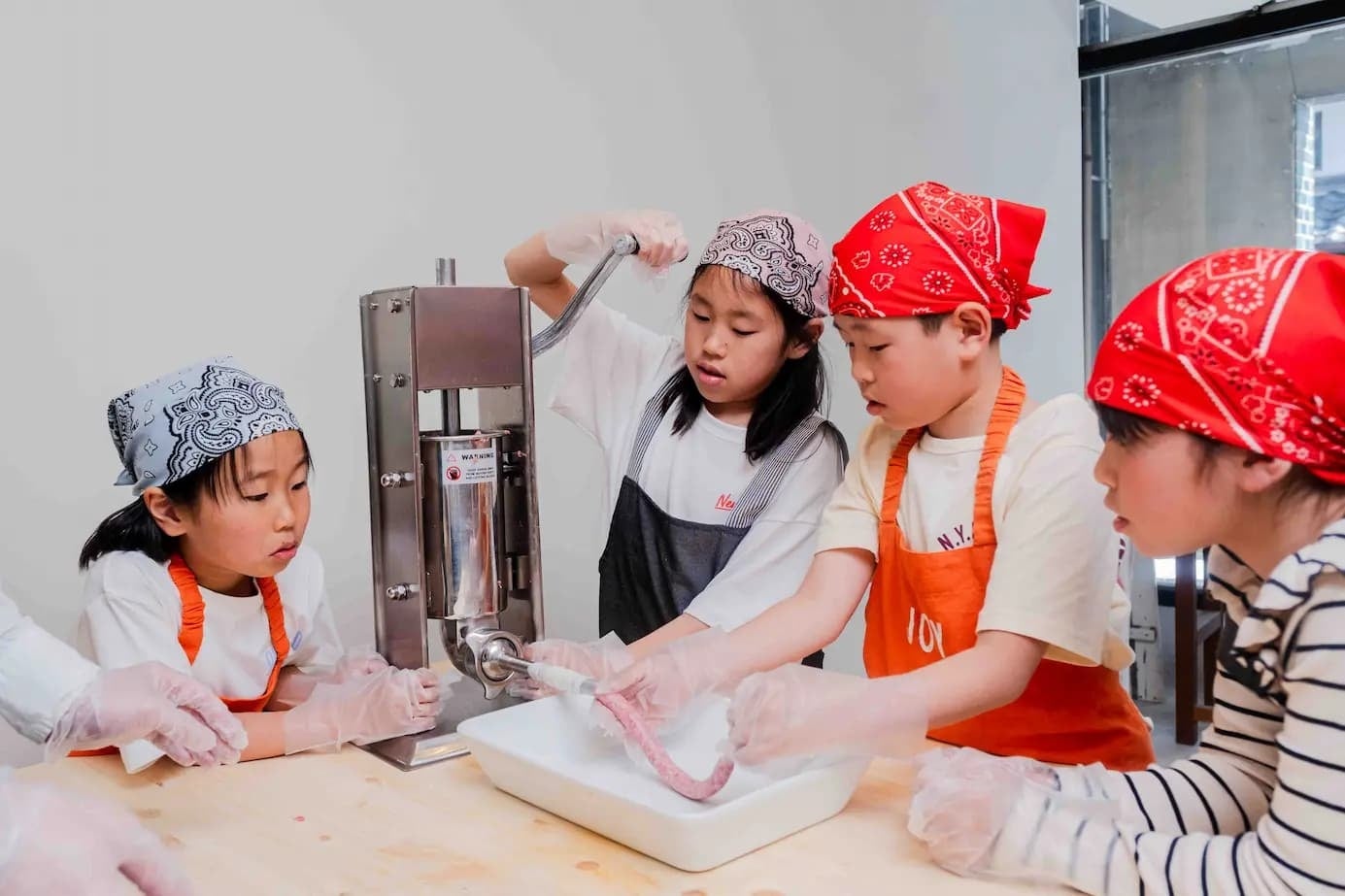 職人も使う大型マシンをフル活用。ミンチ肉を羊腸に詰める爽快感はここでしか味わえません。 -