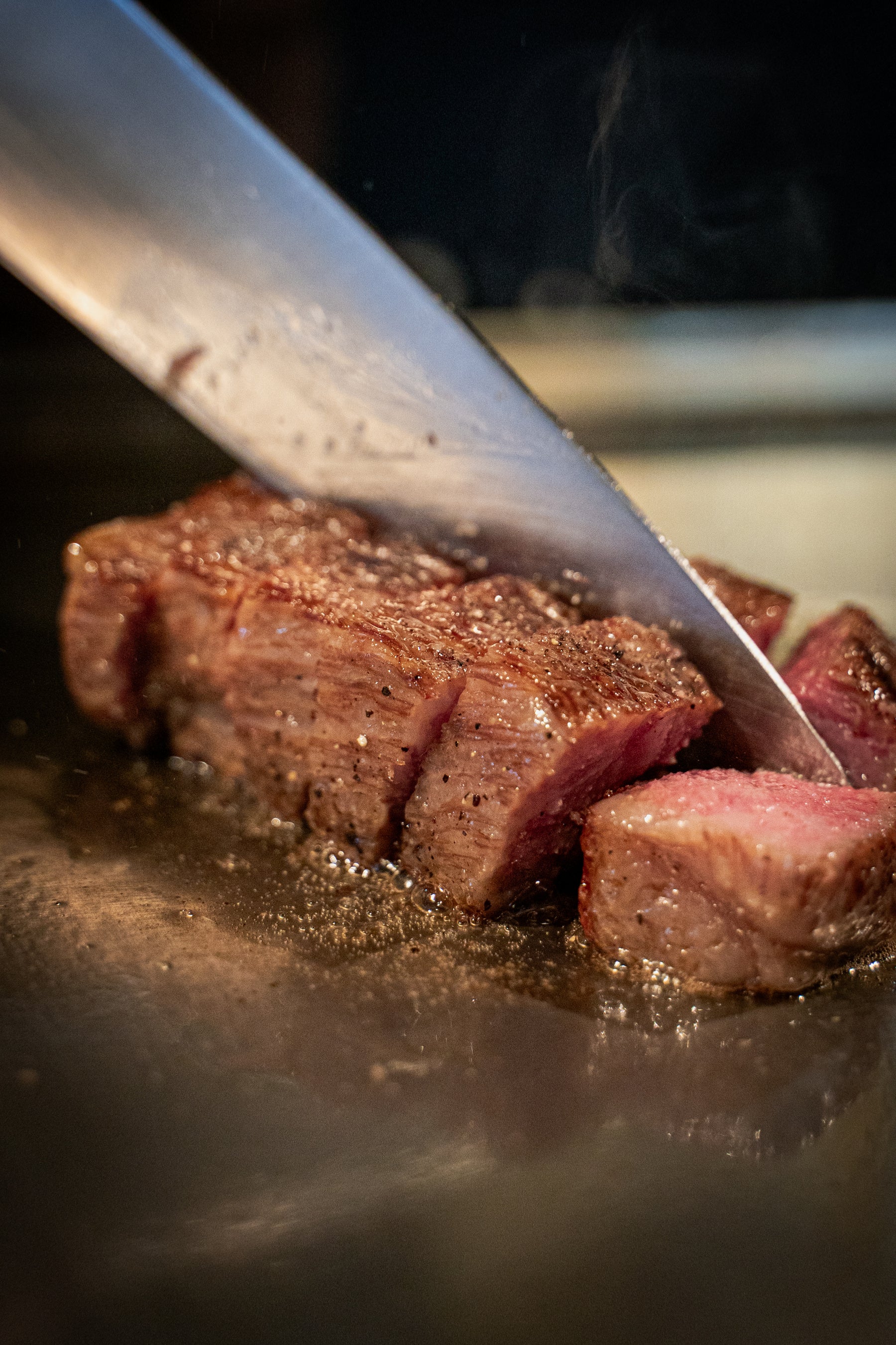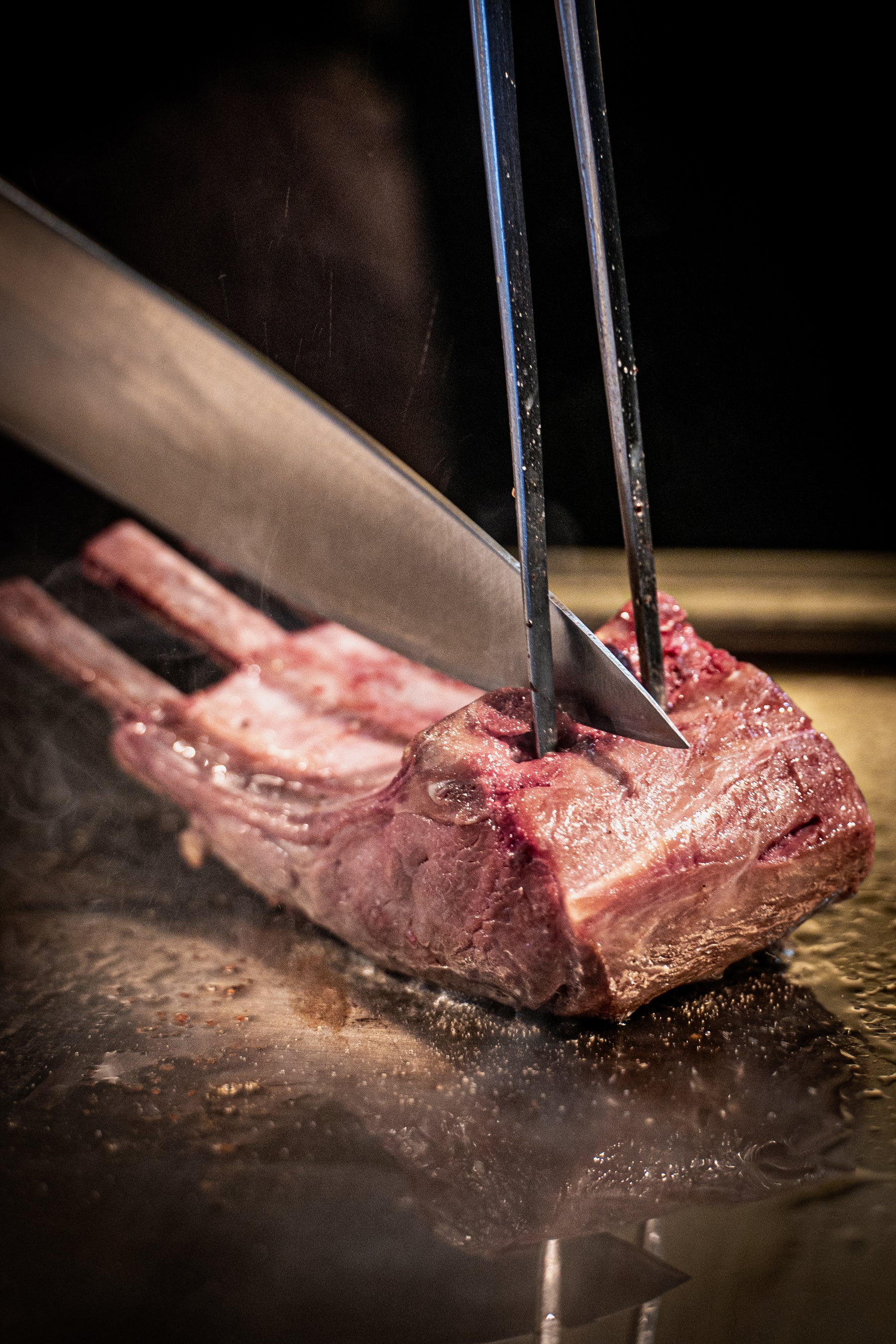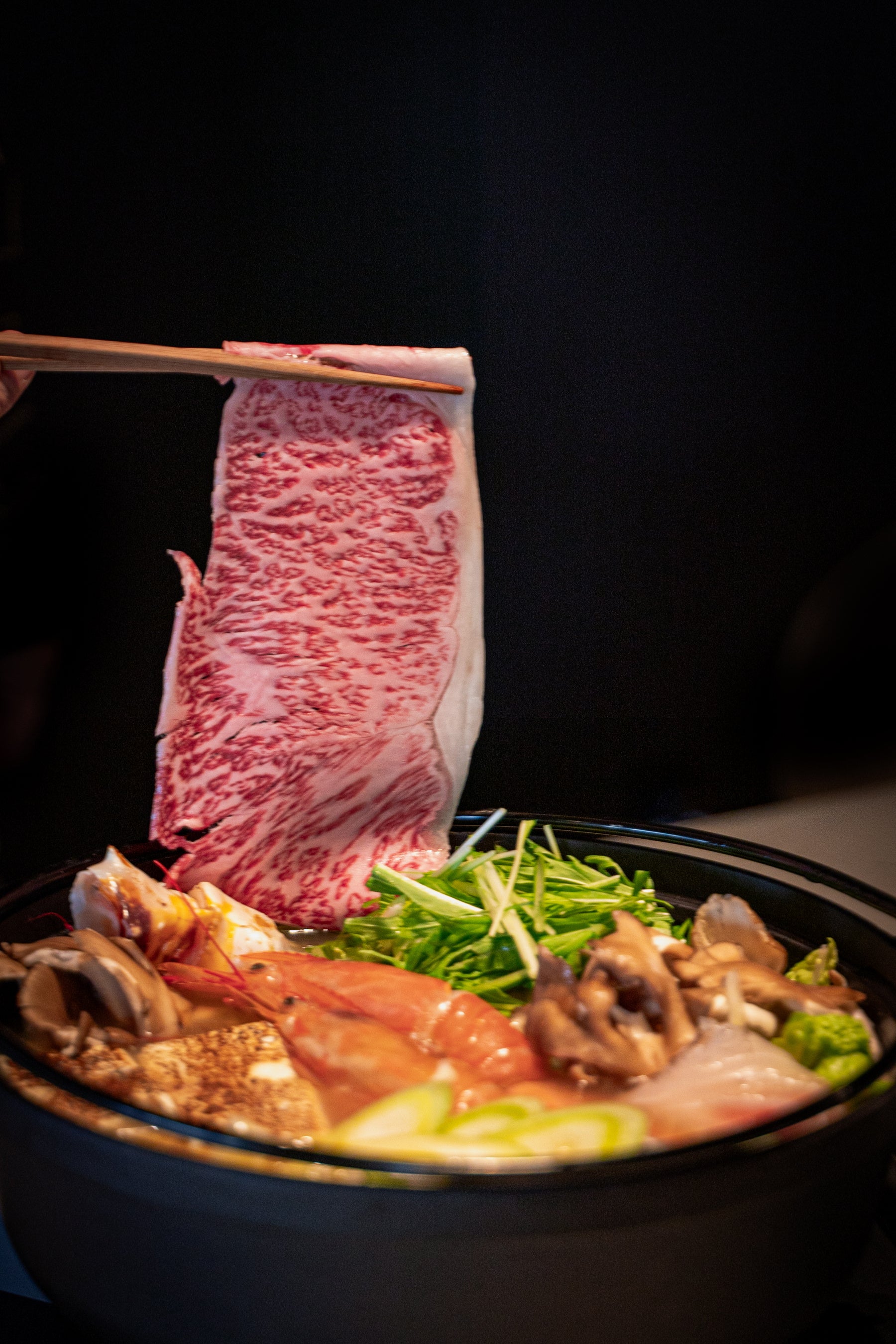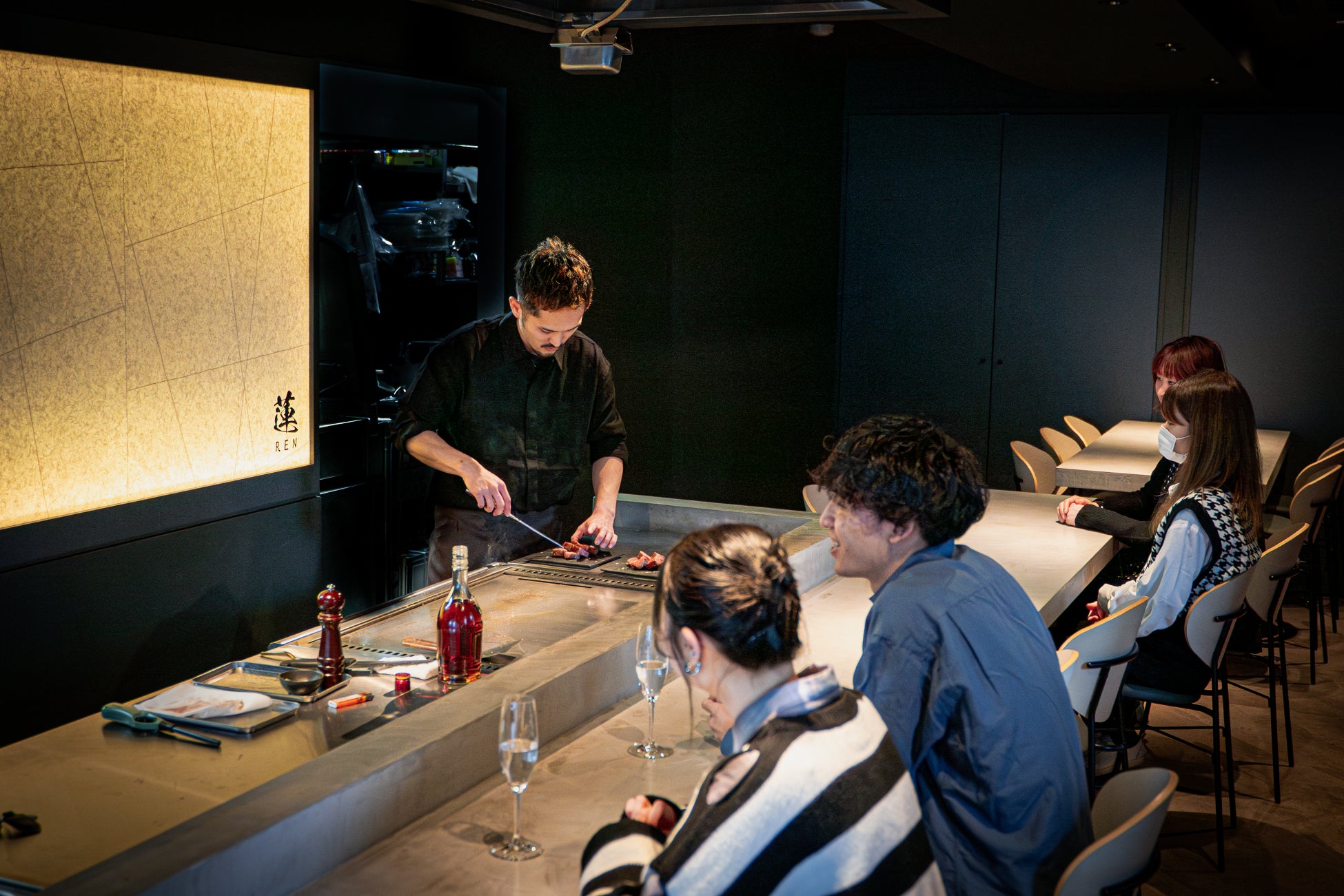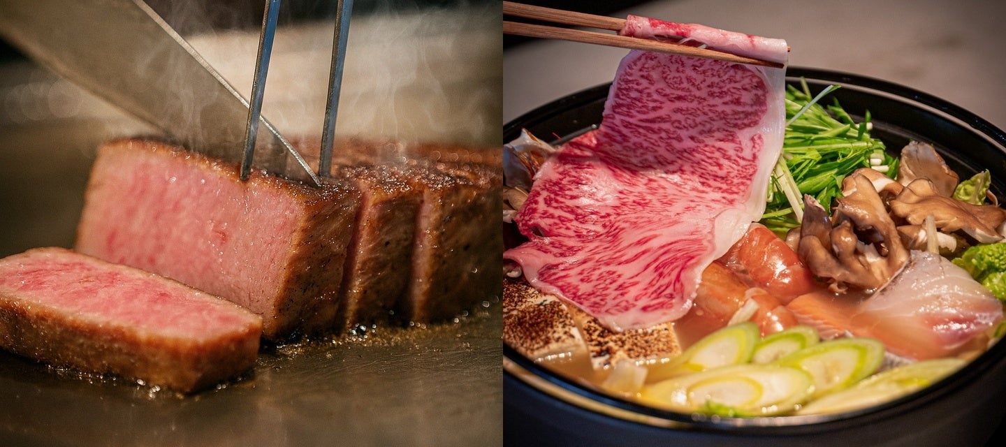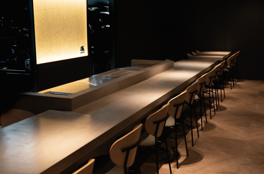 鶏ガラを丁寧に煮出した黄金スープで A5 和牛サーロインをしゃぶしゃぶする〈和牛鶏炊きしゃぶしゃぶ〉と、カウンター越しに五感を刺激する鉄板焼きを同時に提供。