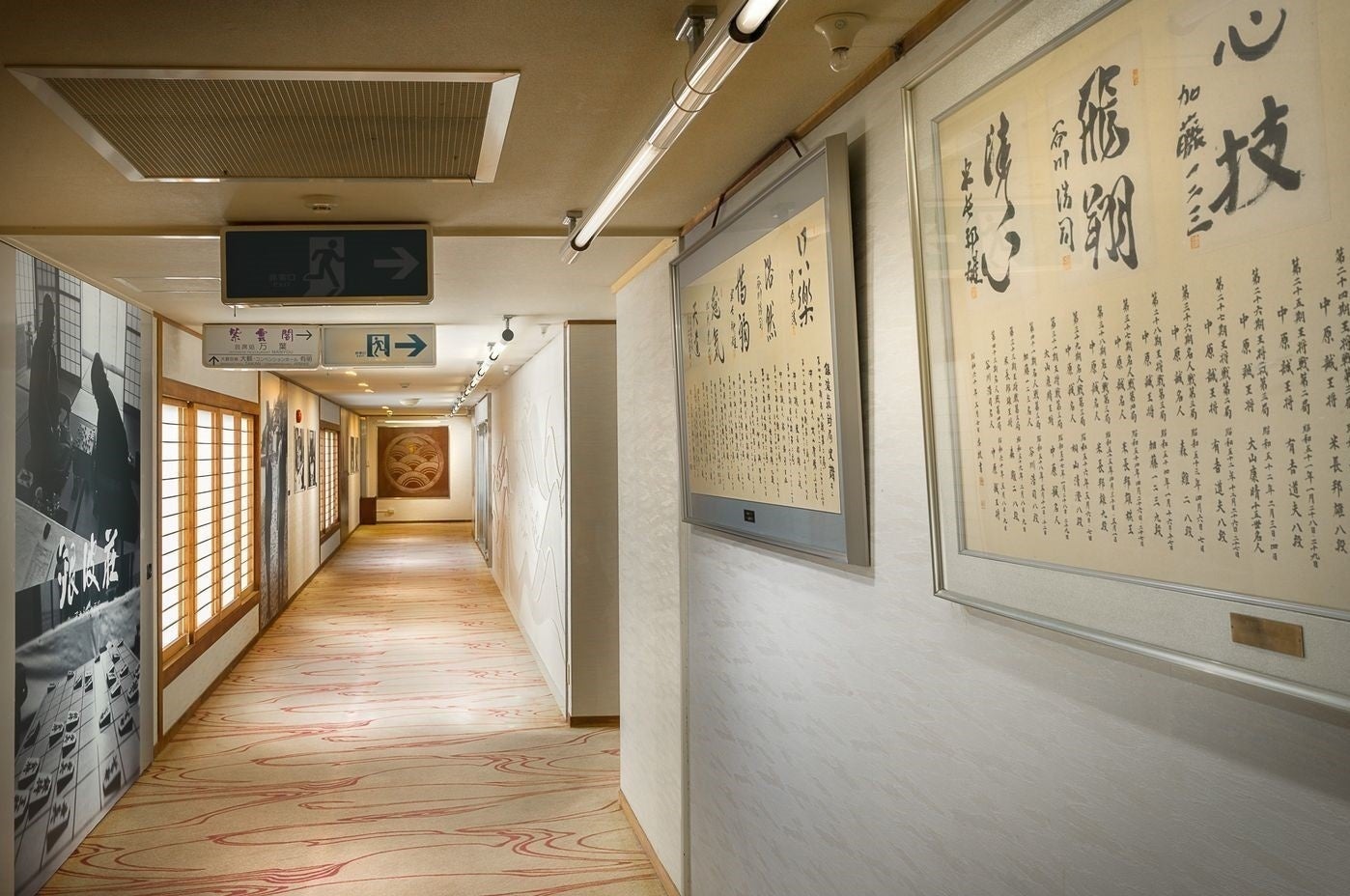 「将棋の宿」としてファンからも親しまれ、1966年以降、大山康晴永世名人、加藤一二三九段、羽生善治九段らが訪れ、これまでに93局の対局が行われてきました。現在開催されている第83期名人戦では第6局の会場にも選ばれています。館内通路には「将棋ロード」が設けられ、写真や対局記録、そして銀波荘のおもてなしの原点ともなる対局に寄り添う姿の数々が展示されており、訪れた方々がその歴史を垣間見ることができます。
