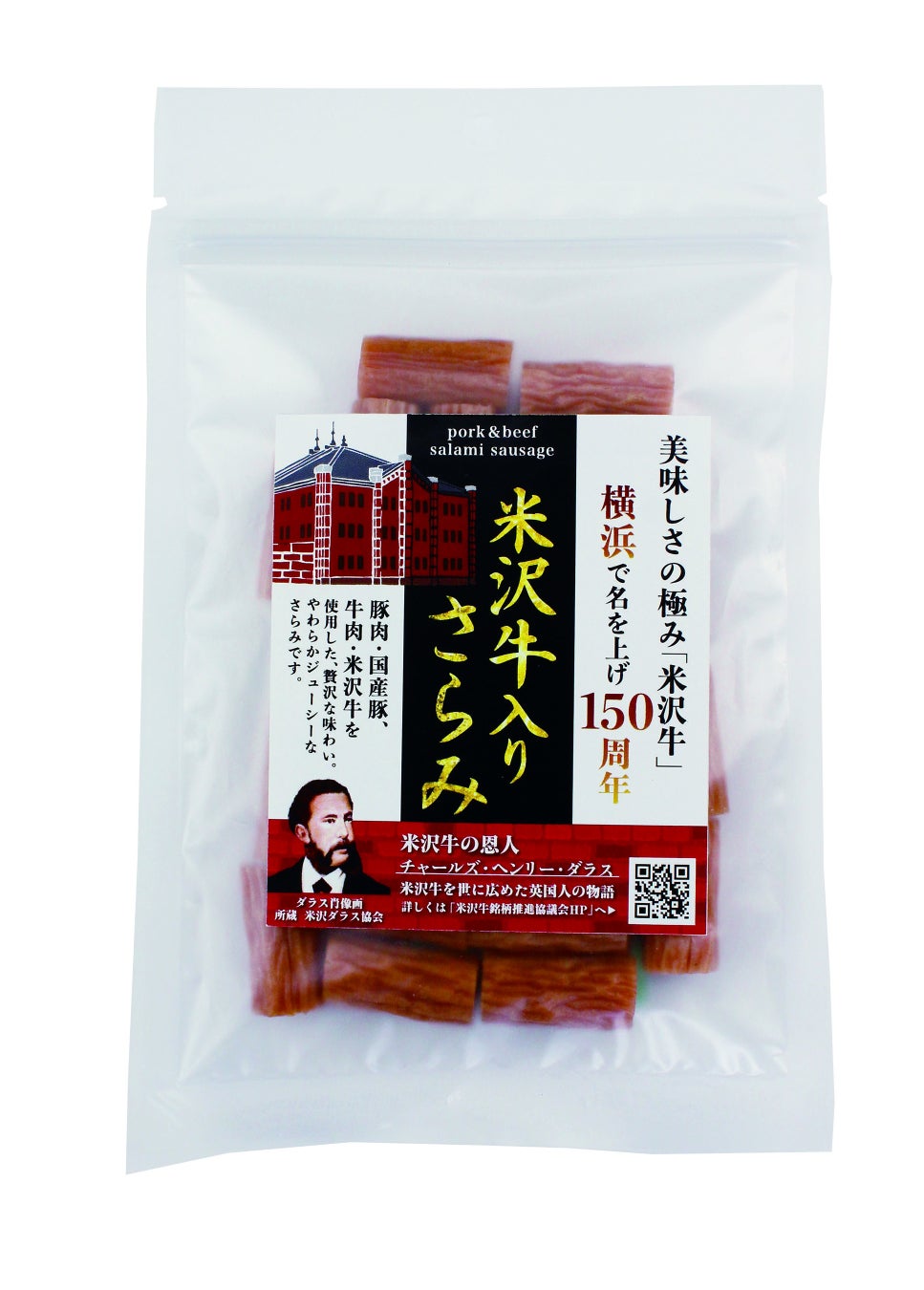 株式会社米沢食肉公社(本社:山形県米沢市、代表取締役社長:佐藤 康寛)は、当社の人気No.1商品である「米沢牛入りさらみ」(内容量95g)を、2025年4月1日(火)より新発売いたしました。今年は、米沢牛が英国人教師C.H.ダラス氏によって横浜から広められて150周年の記念の年です。この節目を祝い、原料肉に米沢牛と国産豚肉のみを使用し、長時間乾燥で旨味を凝縮させた本格サラミの新サイズを発売いたします。適量サイズで常温保存が可能、お酒のおつまみにも最適です。