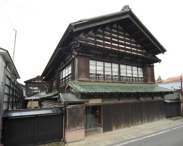 山内家住宅は羽州街道沿いに建つ町家です。1934年に4年の歳月をかけて竣工。本住宅主屋は、梁を重ねた重厚な妻面を見せ、屋根には深緑の釉薬瓦(ゆうやくがわら)が葺かれています。敷地内には軽快な意匠でまとめられた裏座敷の他、文庫蔵、道具蔵、商品蔵、穀蔵といった土蔵群が立ち並び、主屋北側には洋風意匠の車庫が隣接し、優れた街路景観を構成しています。