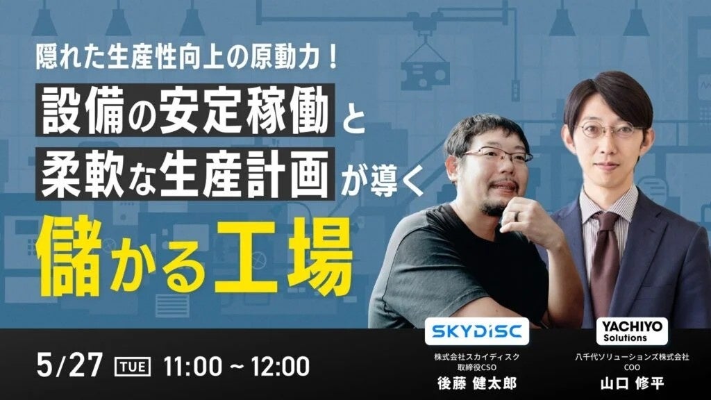 製造業向けクラウド設備管理システム「MENTENA(メンテナ)」を提供する八千代ソリューションズ株式会社(本店:東京都台東区、代表取締役社長:水野 高志)は、生産計画DXサービス「最適ワークス」を展開する株式会社スカイディスク(本社:福岡県福岡市中央区、代表取締役CEO:内村 安里)と共同で、設備と生産計画の両面から生産性向上を目指す無料ウェビナーを、2025年5月27日(火)に開催します。