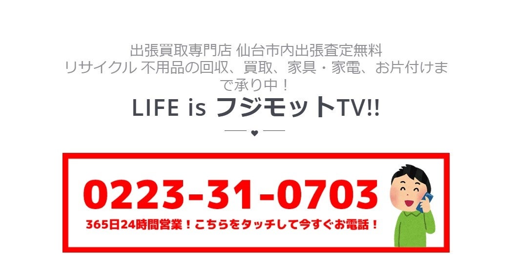 LIFE is フジモットTVは、仙台市内を対象とした出張買取専門店です。家具や家電といった生活用品はもちろんのこと、店舗の閉店に伴う在庫処分など、幅広い品目の買取に対応しています。