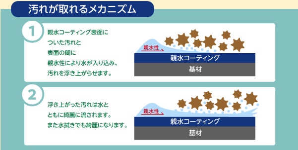 1. わずかな水で油汚れが落ちるKIRAコート※2(超親水コーティング)。水量は大幅低減!お手入れ簡単&衛生面◎