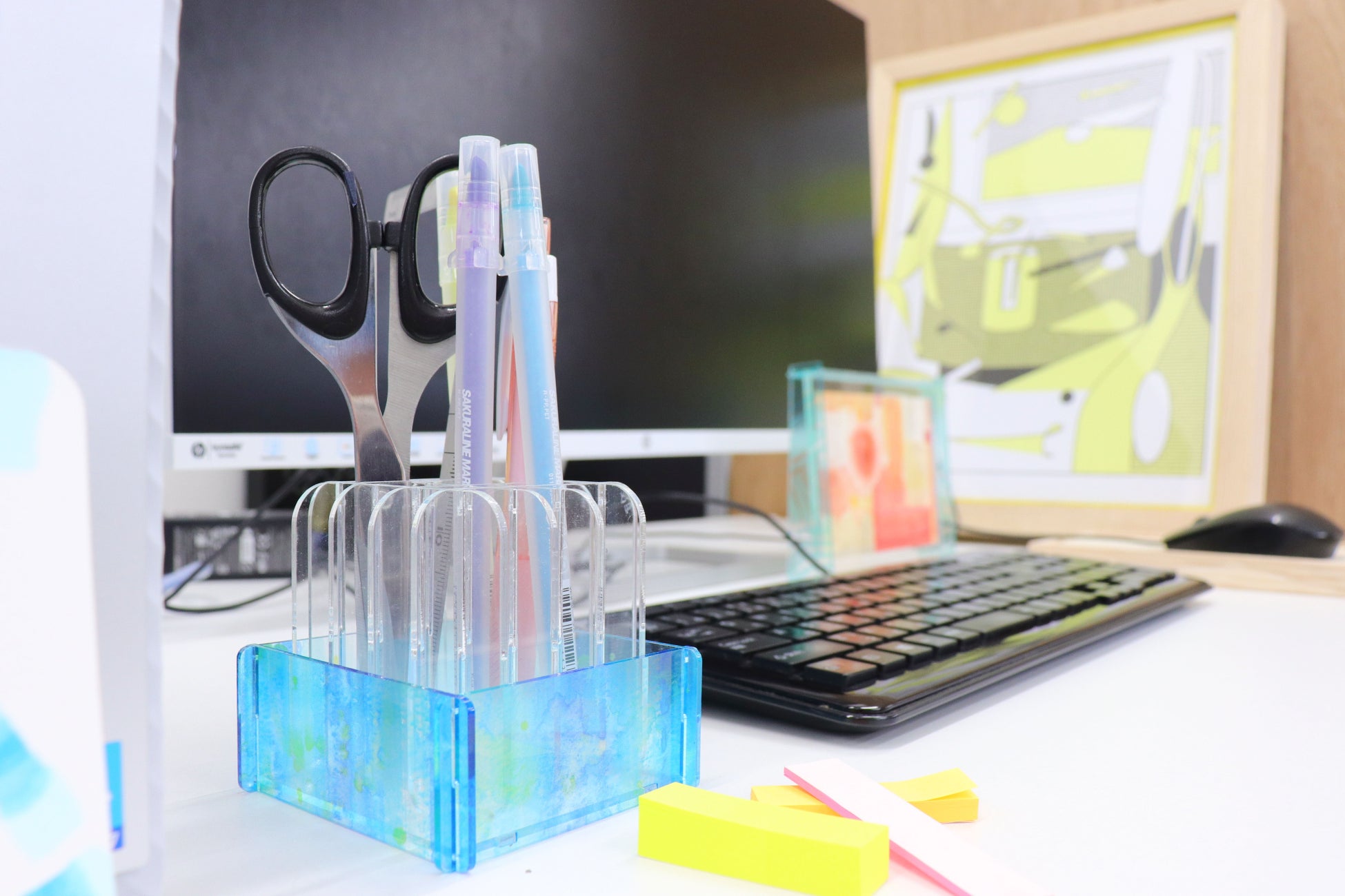 印刷サービスで導入していたレーザーカッターやUVプリンターを組み合わせることで、オリジナリティあふれる表現が可能になりました。さらに、弊社が取り扱う絵の具のテクスチャをアクリルの表面にプリントすることで、画材店としての原点もプロダクトの中に息づかせることができると考えています。