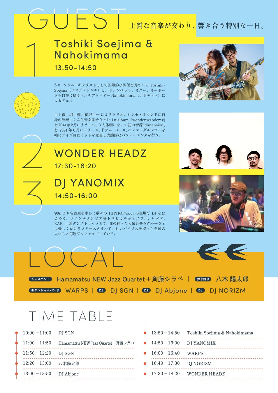 ギターの神様エリック・クラプトンの推しギタリストとしても注目を集めるネオ・ソウル・ギタリスト「Toshiki Soejima」と「Nahokimama」のデュオや、インストゥルメンタルバンドNABOWAのリズム隊として活動していた、ドラムス川上優とベース堀川達にハンマーダルシマー奏者藤沢由一が加わる「WONDER HEADZ」をゲストに迎え、ローカル奏者・DJ陣にて1日を通じてジャズ〜ソウル〜ダンスと上質な音楽が絶えず流れる空間を提供。音楽に身を委ねながら、飲食や買い物、サウナ体験やアート・ヨガ等もお楽しみいただけるマルシェエリアも充実です。
