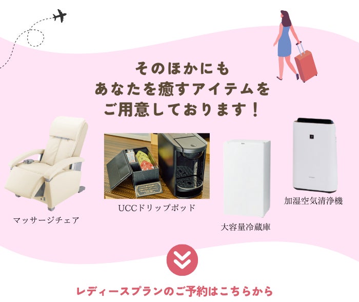 マッサージチェアやUCCドリップポッド、大容量冷蔵庫、加湿空気清浄機などをルームに設置していますので、快適なご宿泊をお楽しみいただけます。
