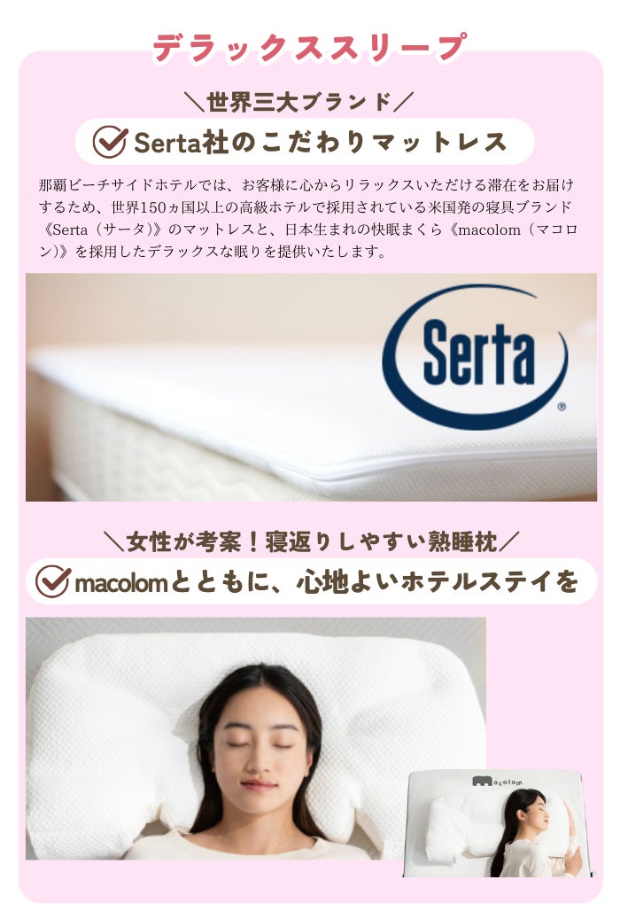 那覇ビーチサイドホテルでは、お客様に心からリラックスしていただける滞在をお届けするため、世界150ヵ国以上の高級ホテルで採用されている米国発の寝具ブランド《Serta(サータ)》のマットレスと、日本生まれの快眠まくら《macolom(マコロン)》を採用したデラックスな眠りを提供いたします。